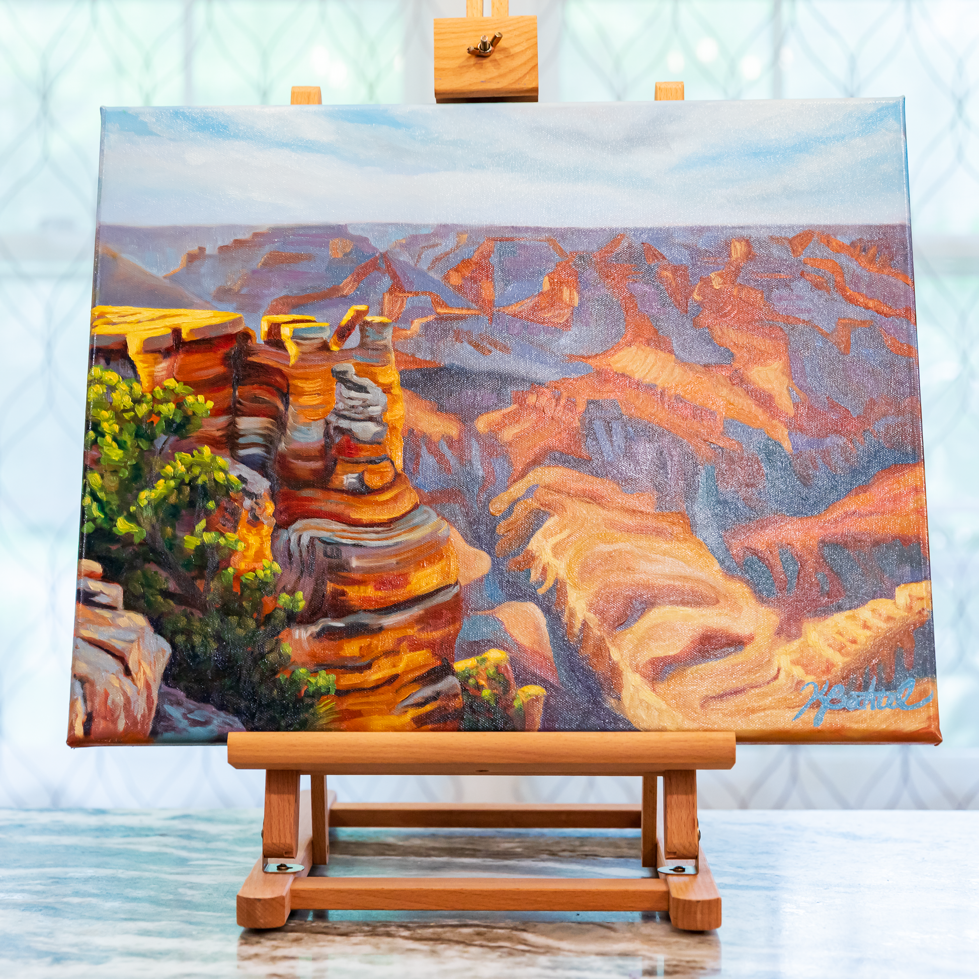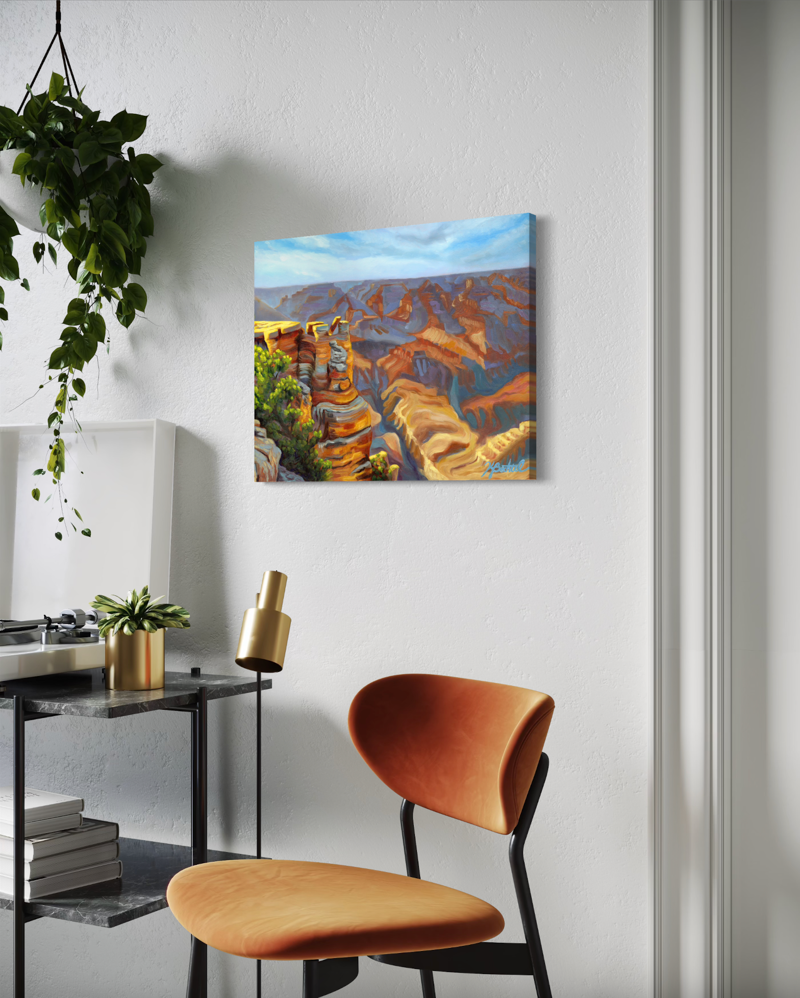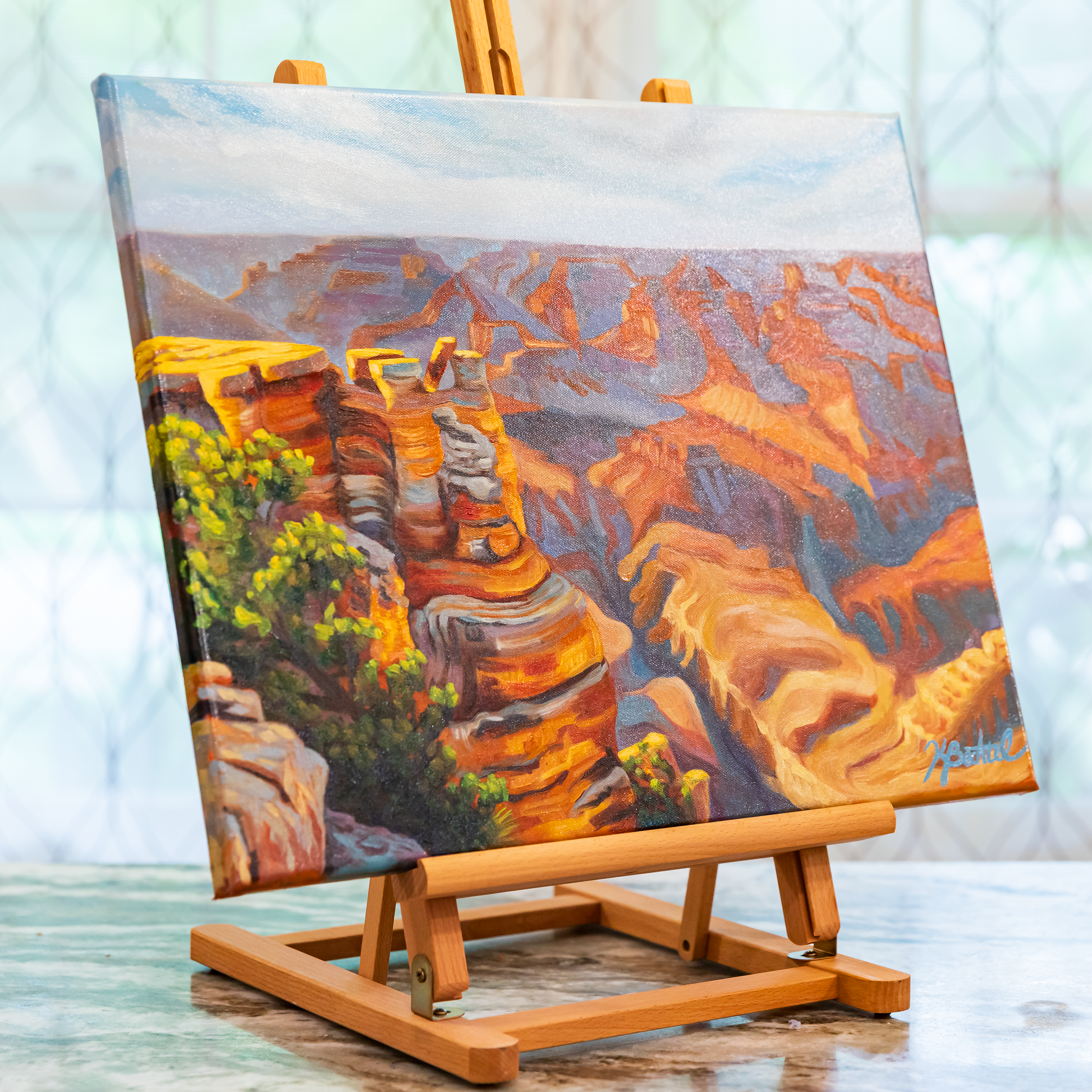Rich, textural oil paint sculpts the folds of rock and the rising cliff of the Grand Canyon south rim in Arizona as golden hour settles on the edge of the rock formations, illuminating the cliff in golden yellow light.