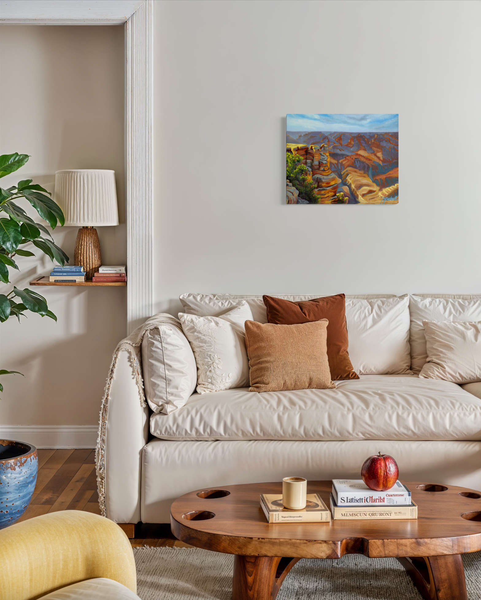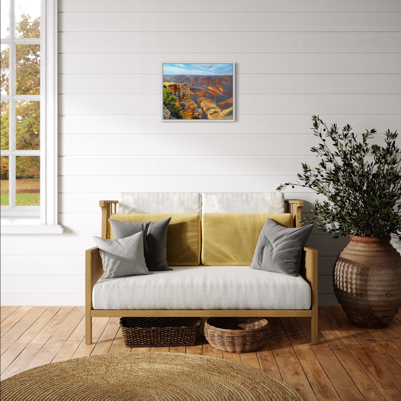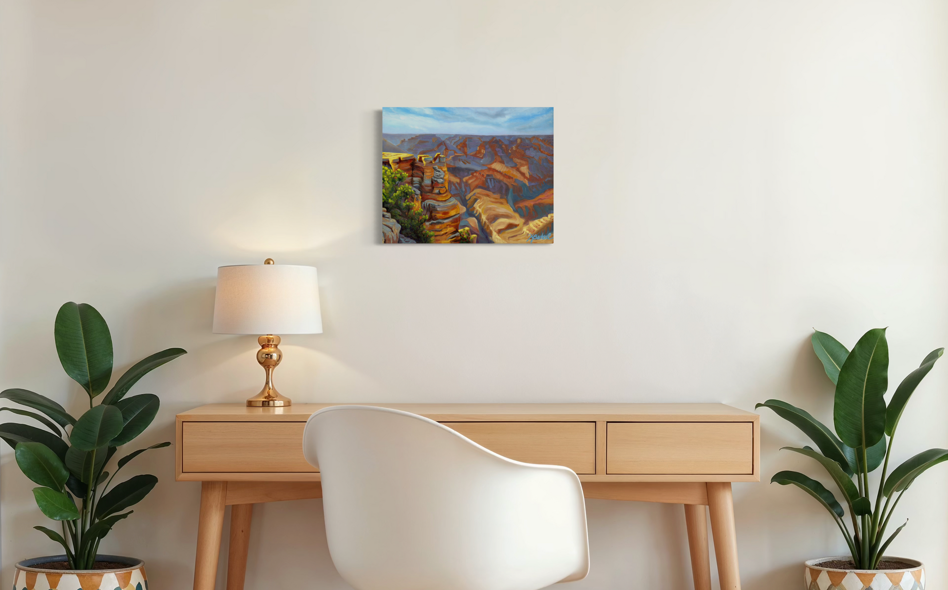 Rich, textural oil paint sculpts the folds of rock and the rising cliff of the Grand Canyon south rim in Arizona as golden hour settles on the edge of the rock formations, illuminating the cliff in golden yellow light.