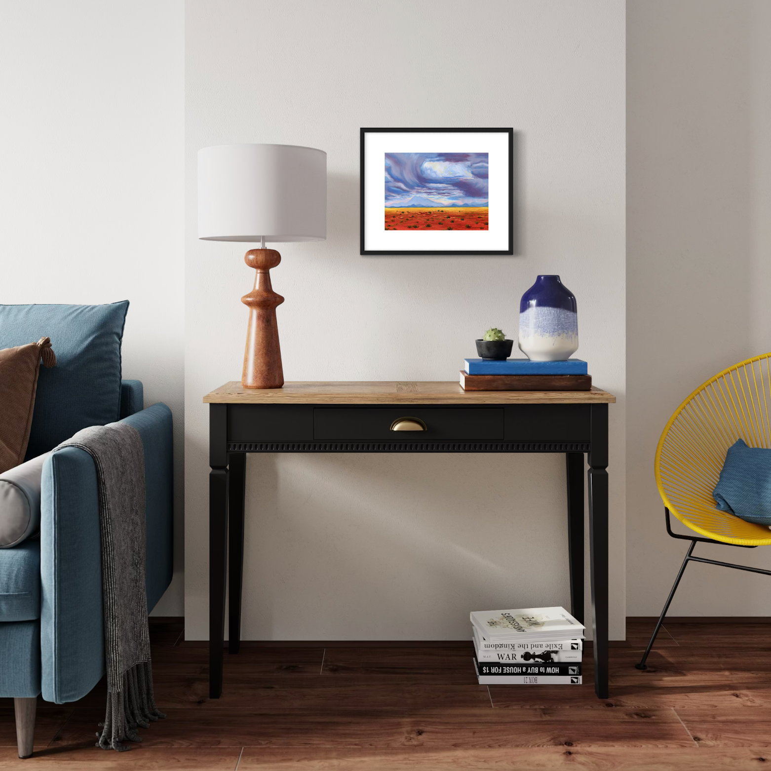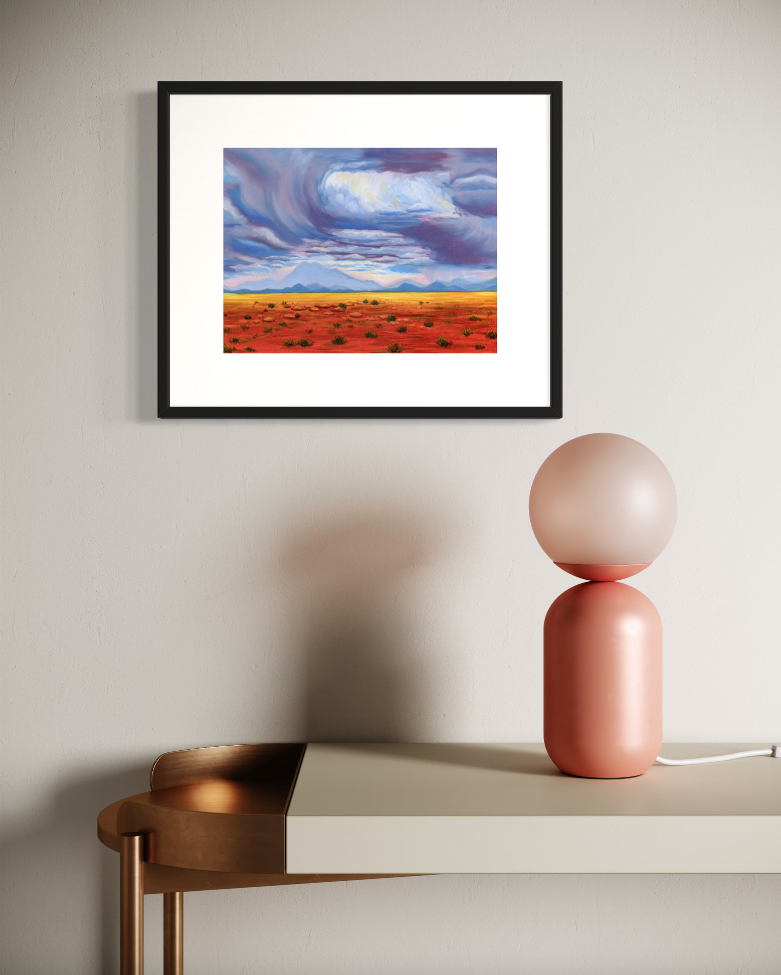 Fine art print of original oil painting, "Arizona Sky" painted in 2025 after a family vacation to Arizona. The contrast between red earth and blue sky motivated the painting.