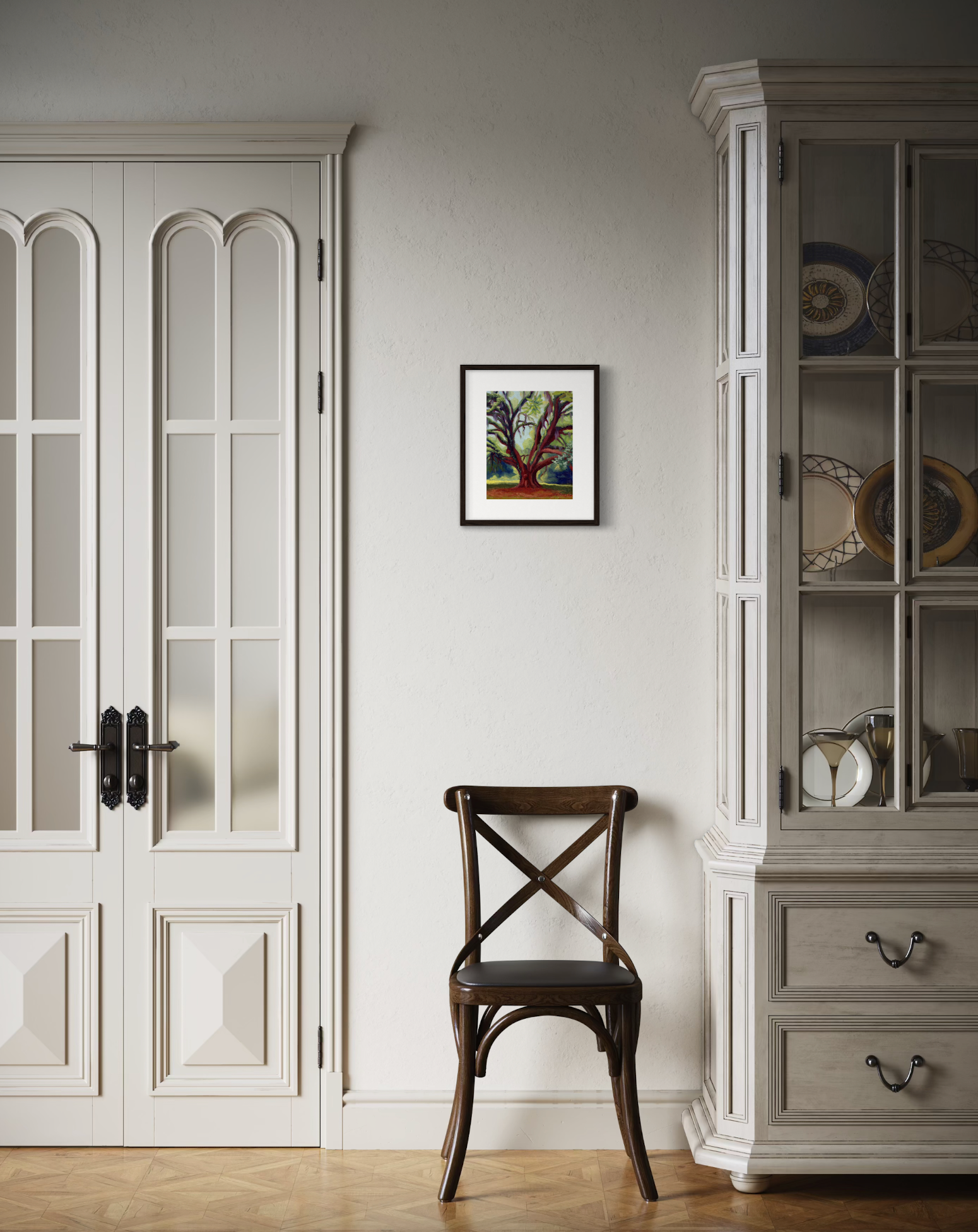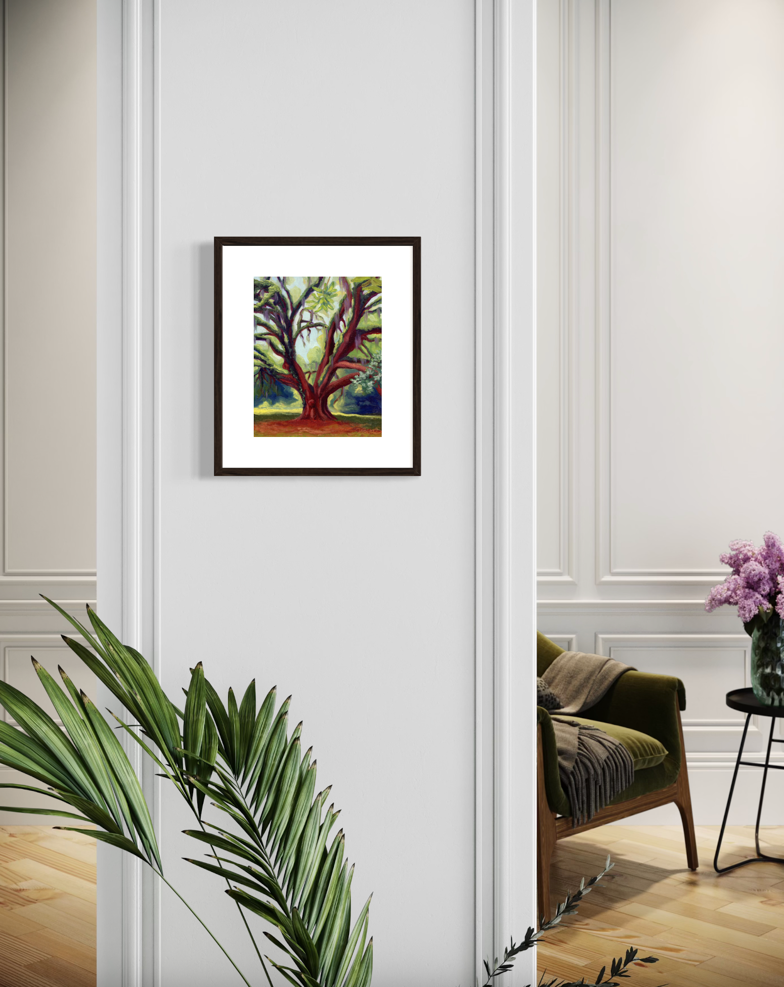 Fine art print on matte paper of "Standing Tall" an original oil painting capturing a majestic old oak tree.