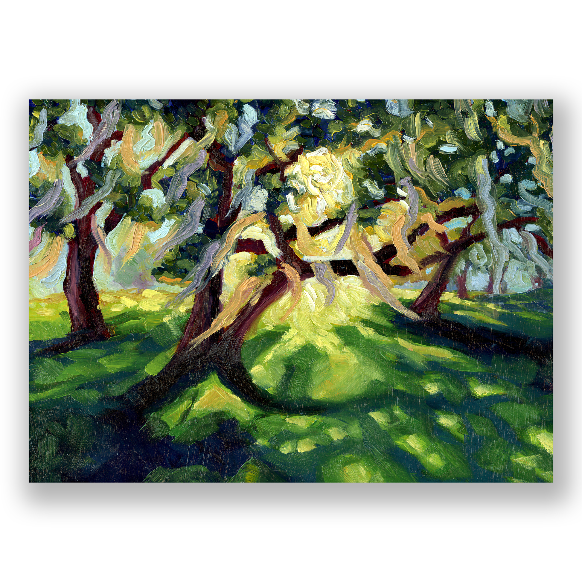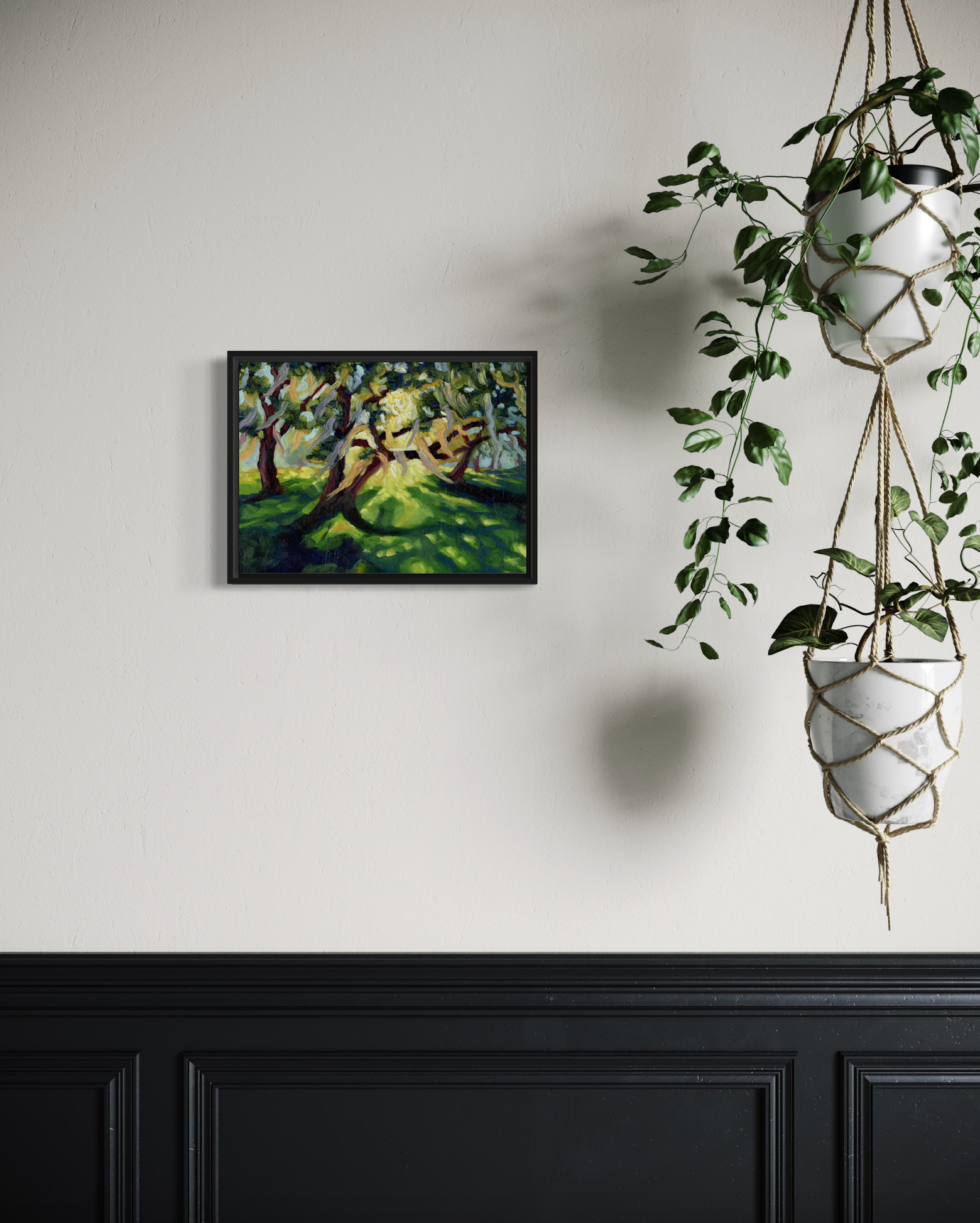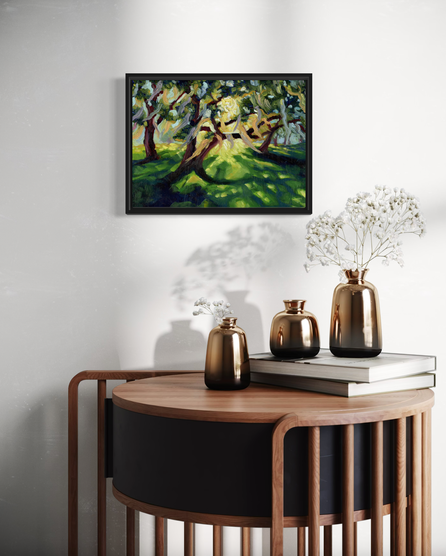 Light glows through moss hanging from sweeping oak trees with dappled light on the ground in this oil landscape painting, Richly colored impasto oil paint sweeps across this painting mimicking the wind-swayed moss in these backlit oak trees. North Florida is blanketed in moss covered oak trees, glowing in the light of golden hour and this painting aims to capture that magic.