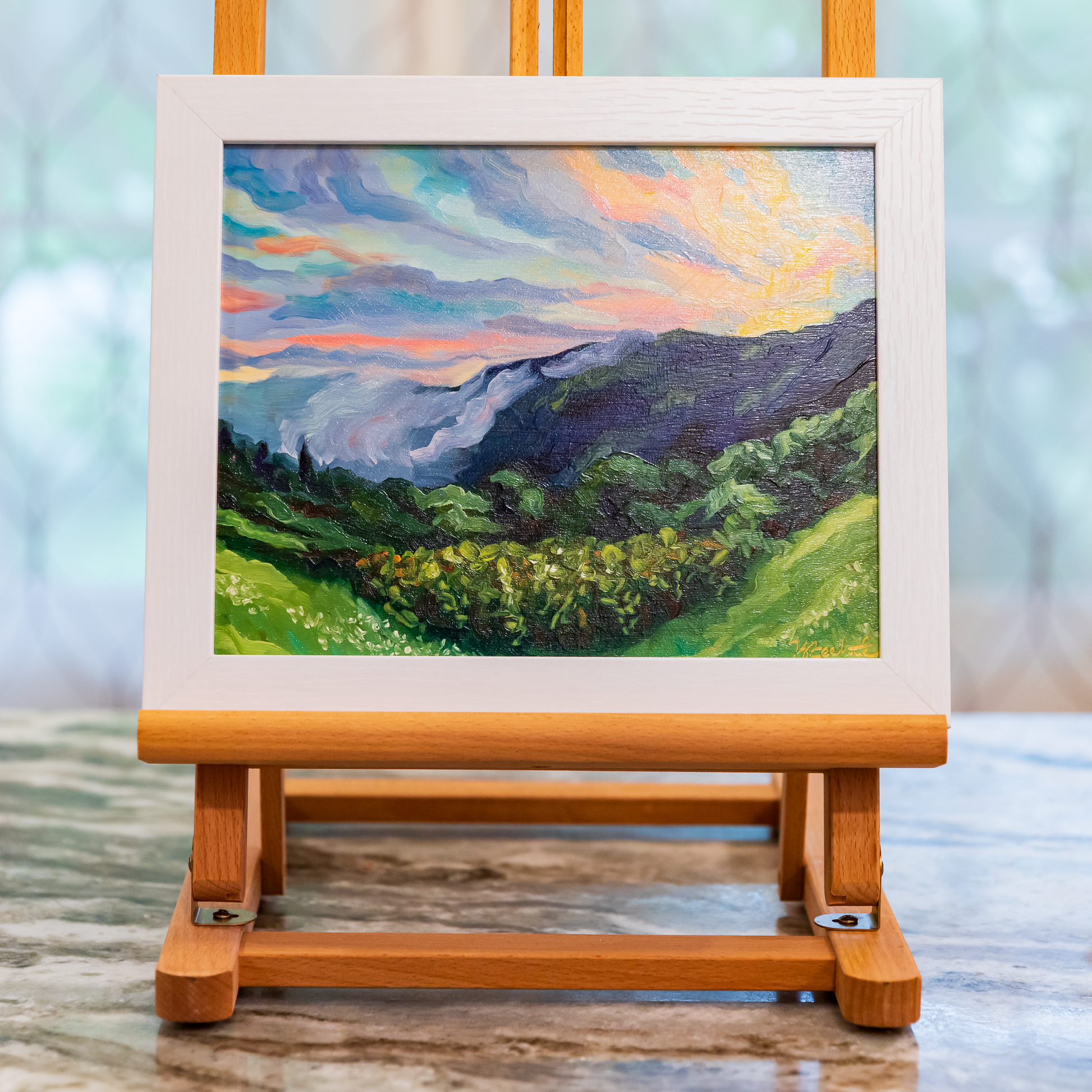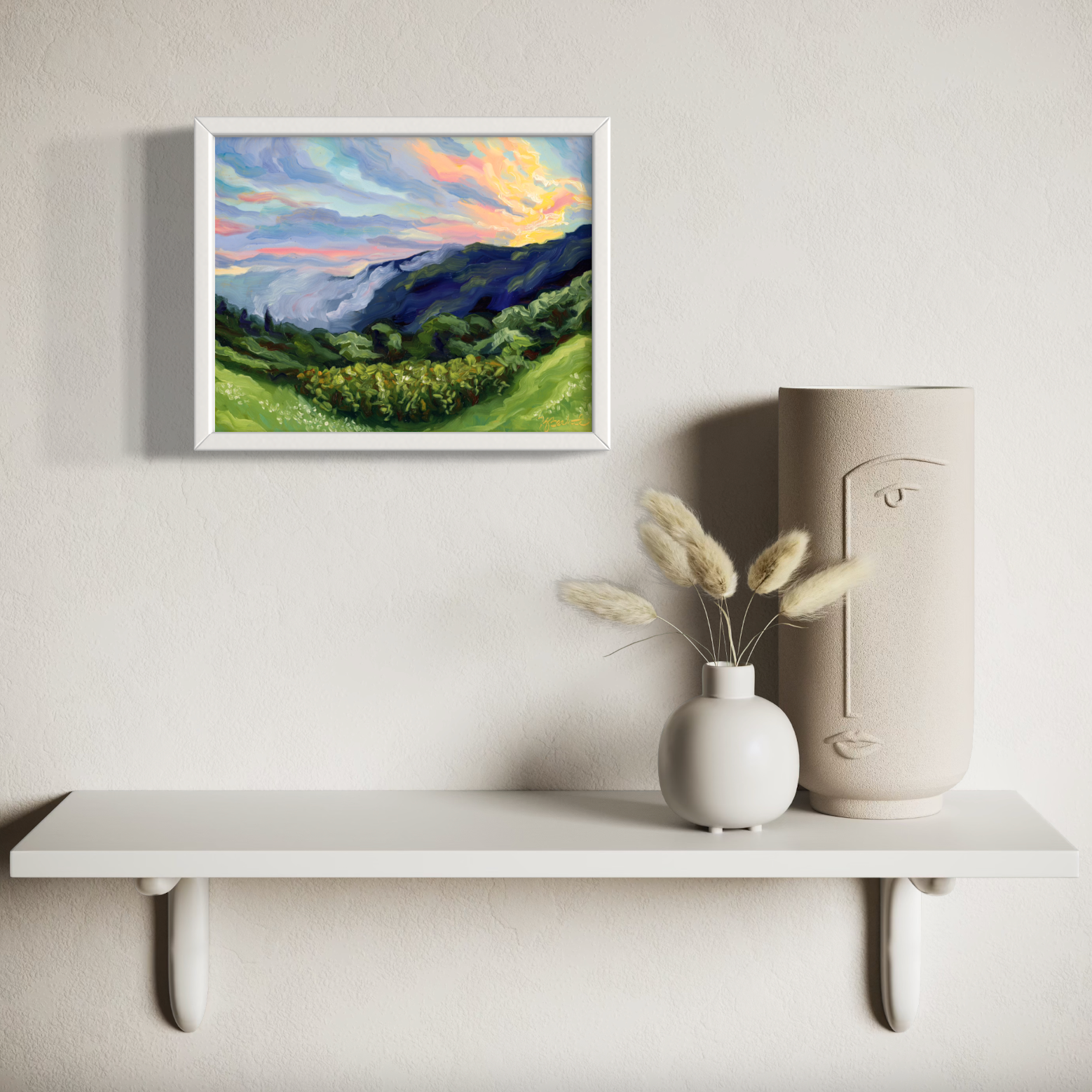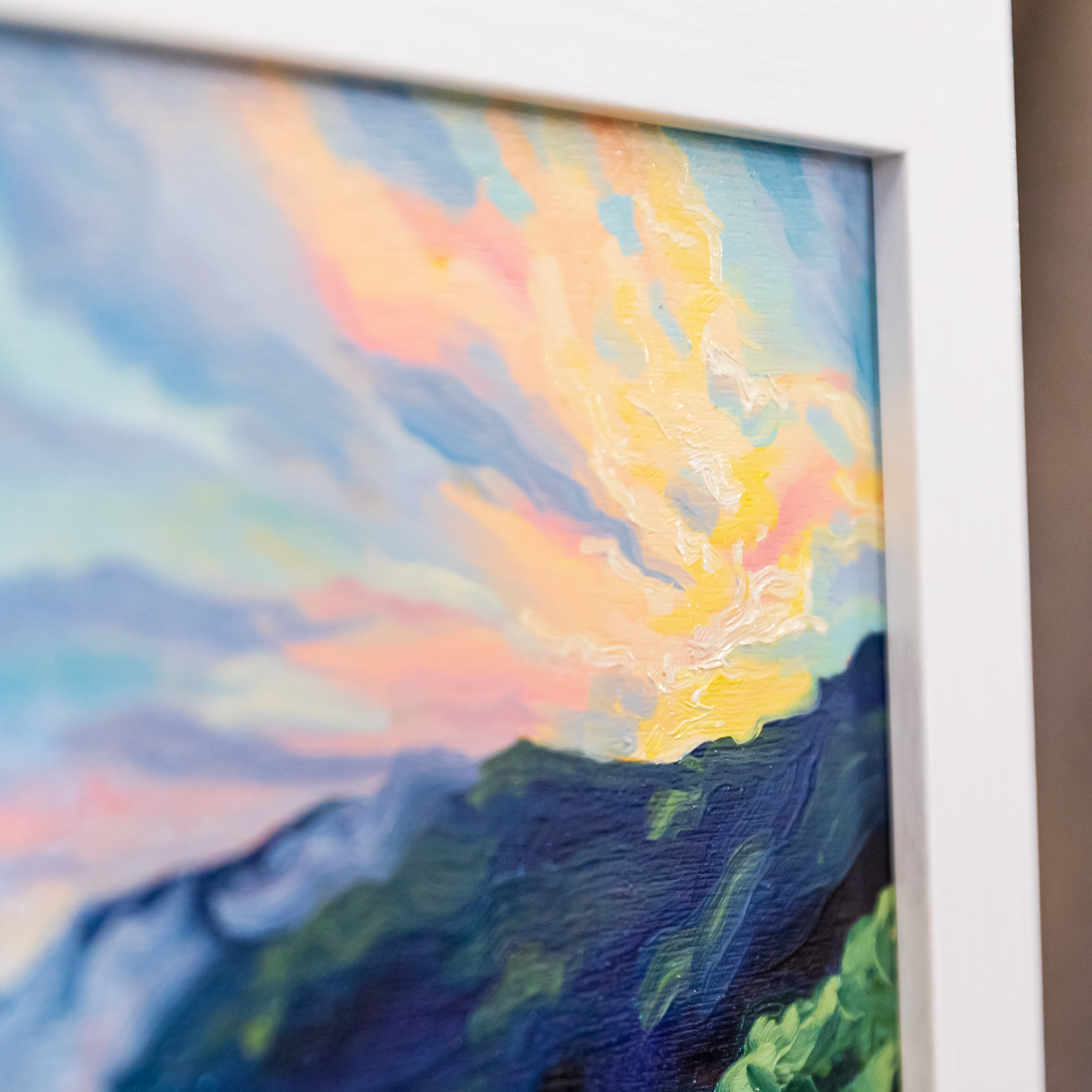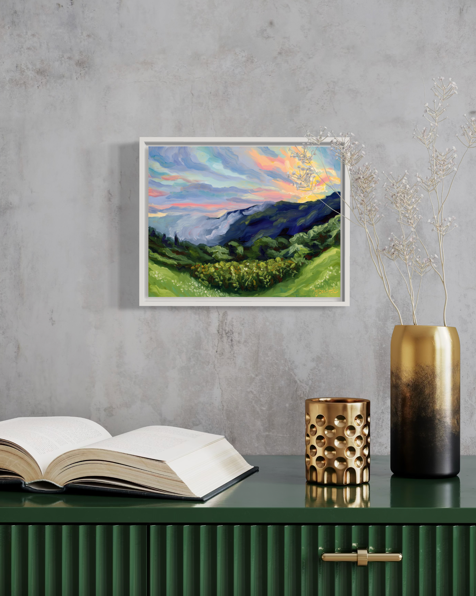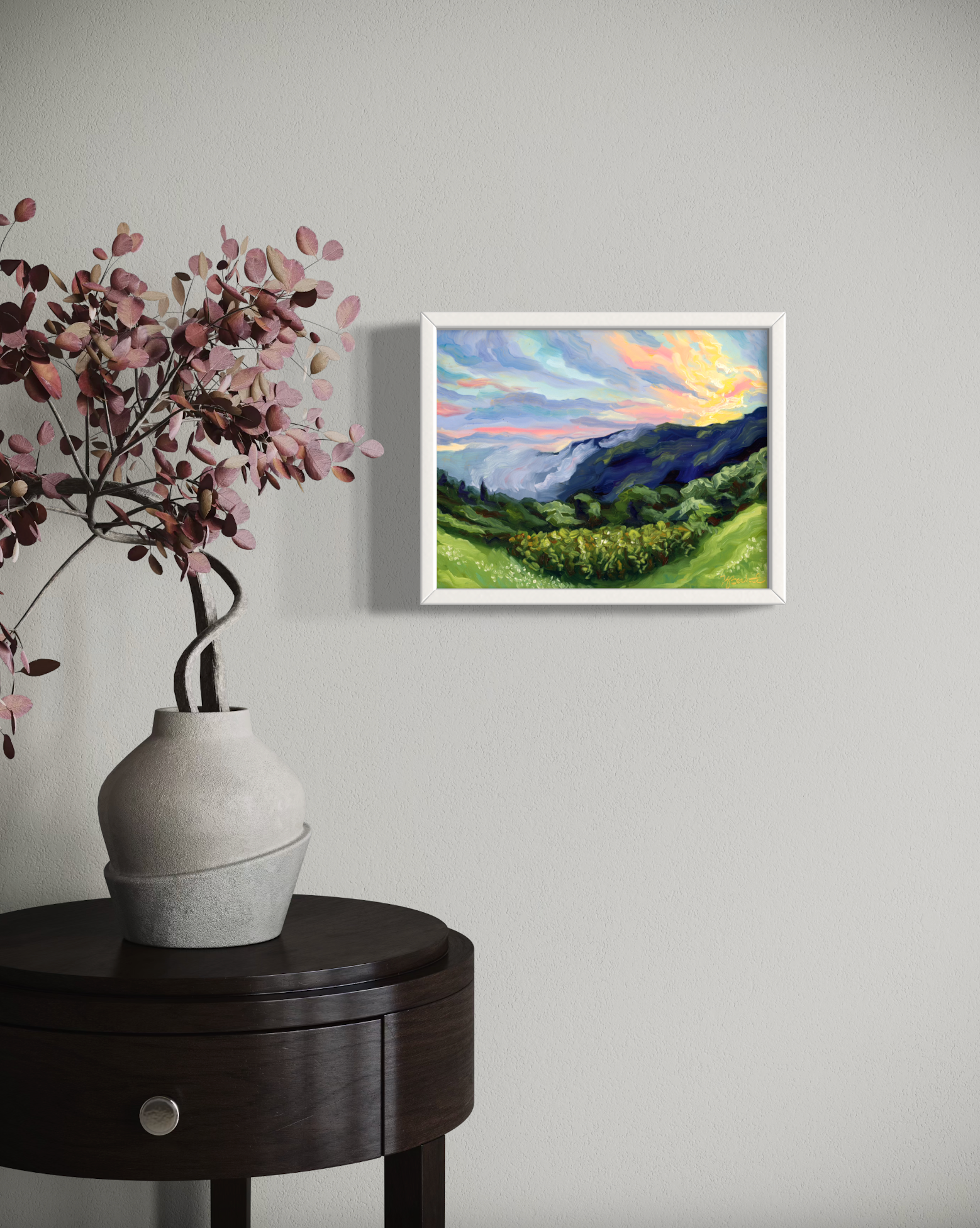 The sky is alive with color between the rich brushstrokes of the sunset to the rolling mist flowing over the blue ridge mountains. This painting balances the soft subdued tones of fog with the vibrant and radiant colors of sunset in the mountains.