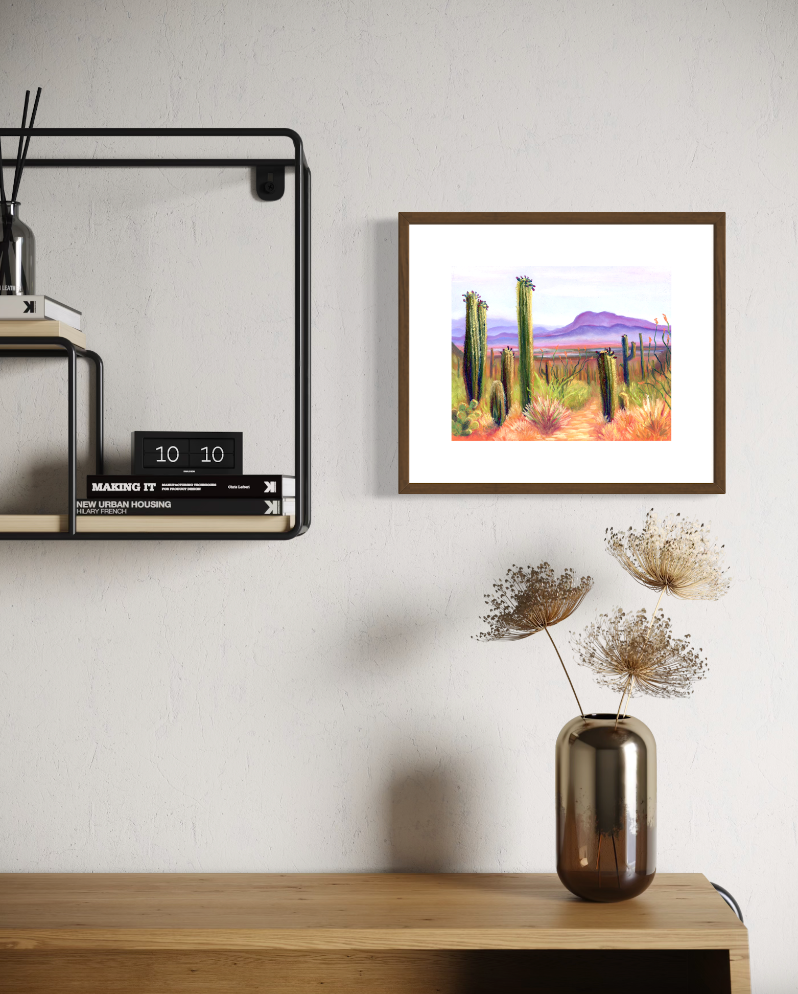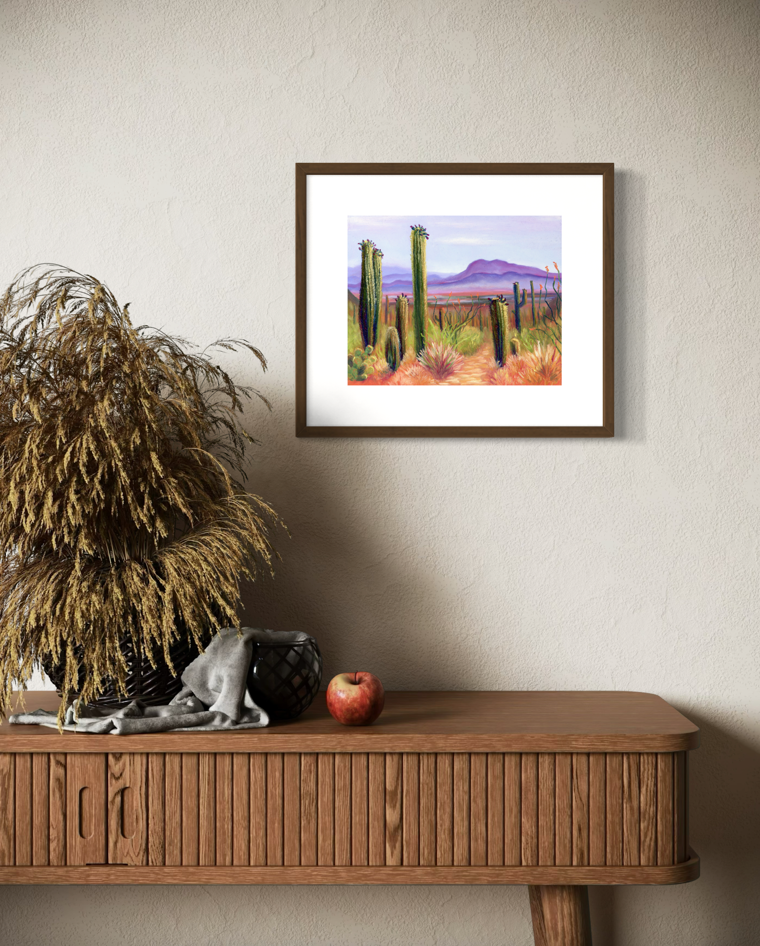 Fine art print on matte paper of original oil painting. "Saguaro Distance" was painted in 2025 from the view of saguaro cacti fading into the distance at Saguaro National Park in Arizona. This print allows collectors to bring an affordable version of the view into their homes.