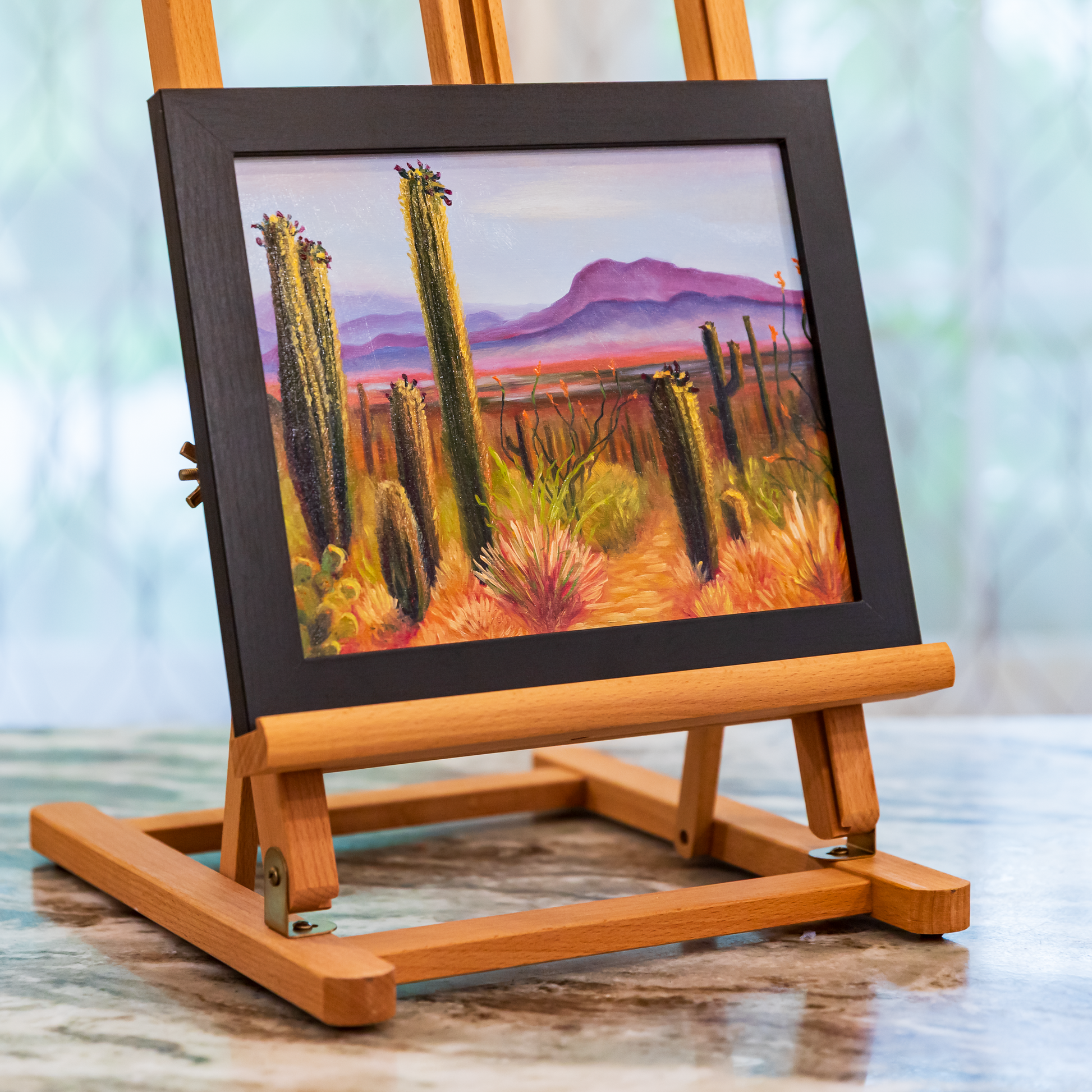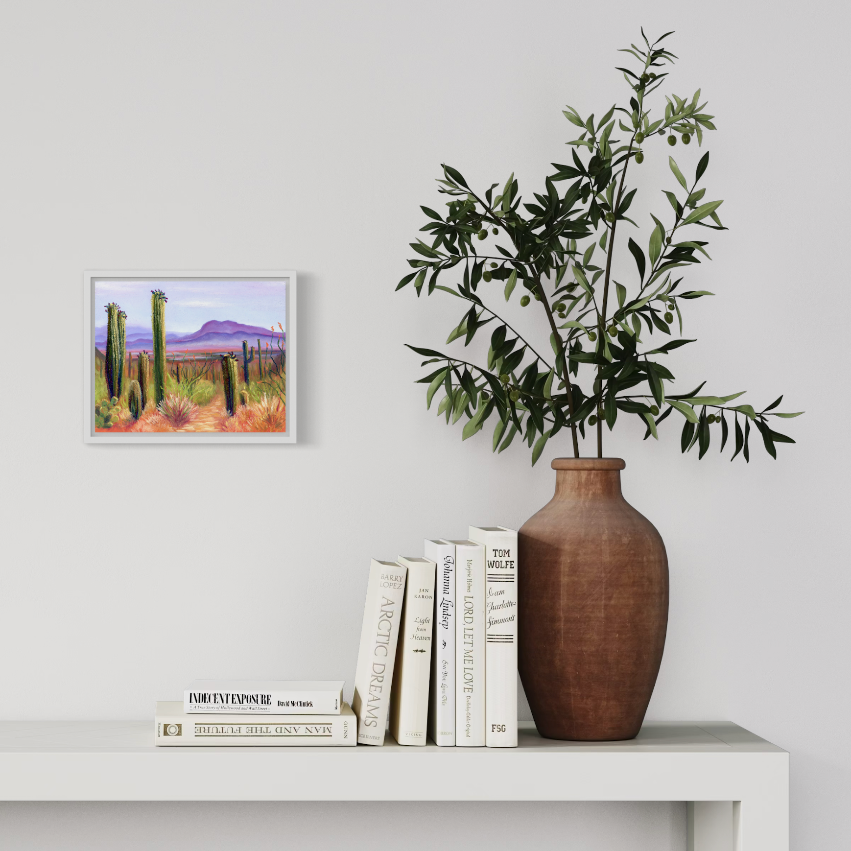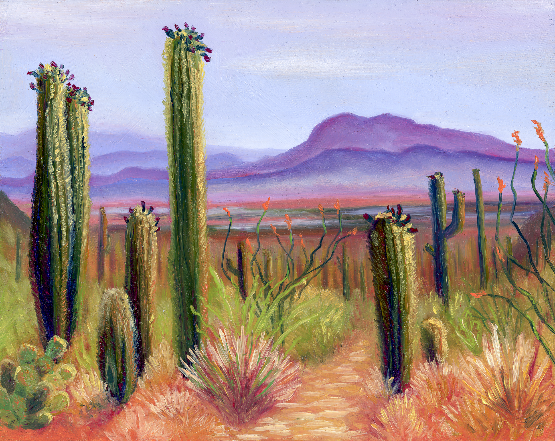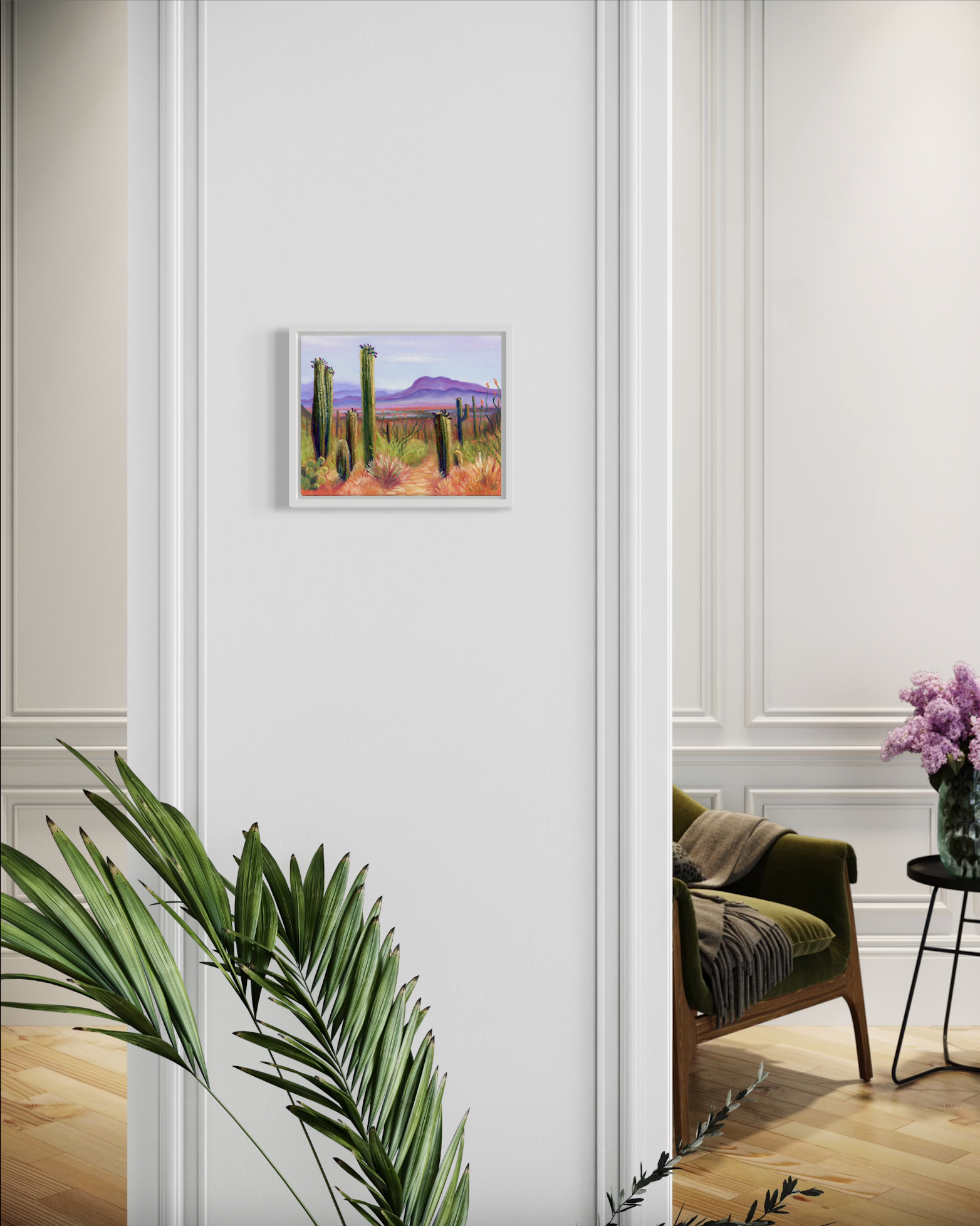 Saguaro Cacti stand proud across the land as they recede into the distance of the Arizona landscape at Saguaro National Park. Light and texture highlight the delicate spines of the cacti both large and small. Warm, golden foreground stands in contrast to purple atmospheric mountains in the background of this unique original landscape painting.