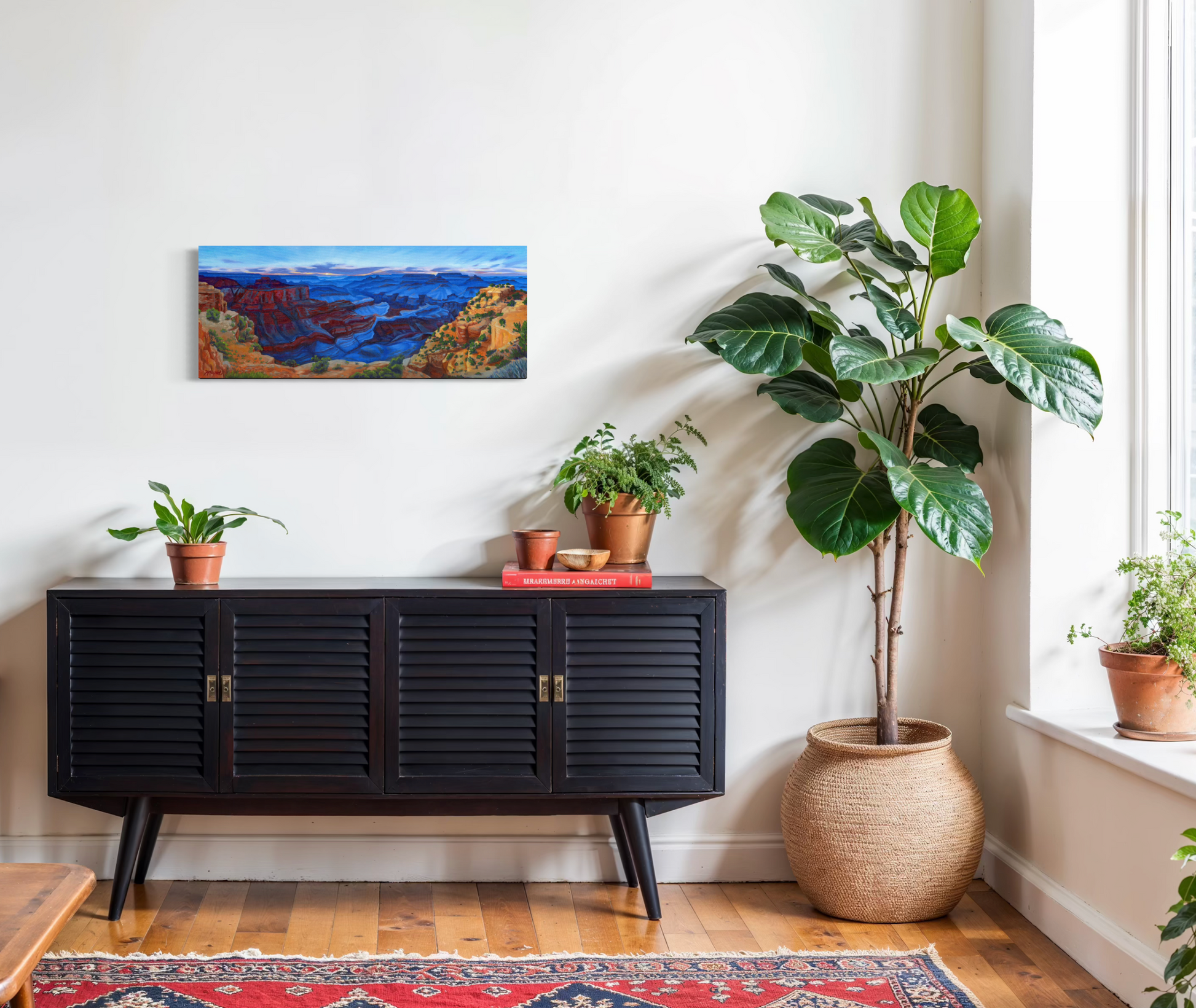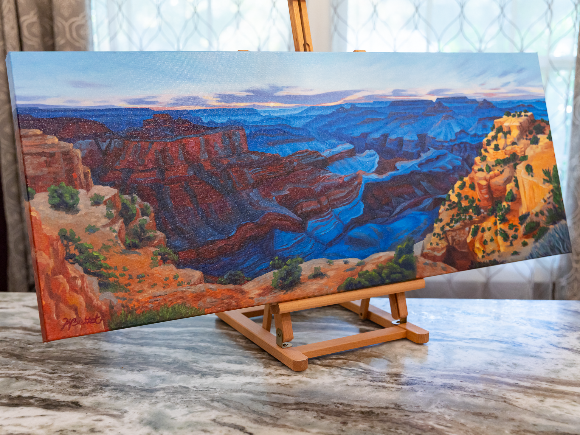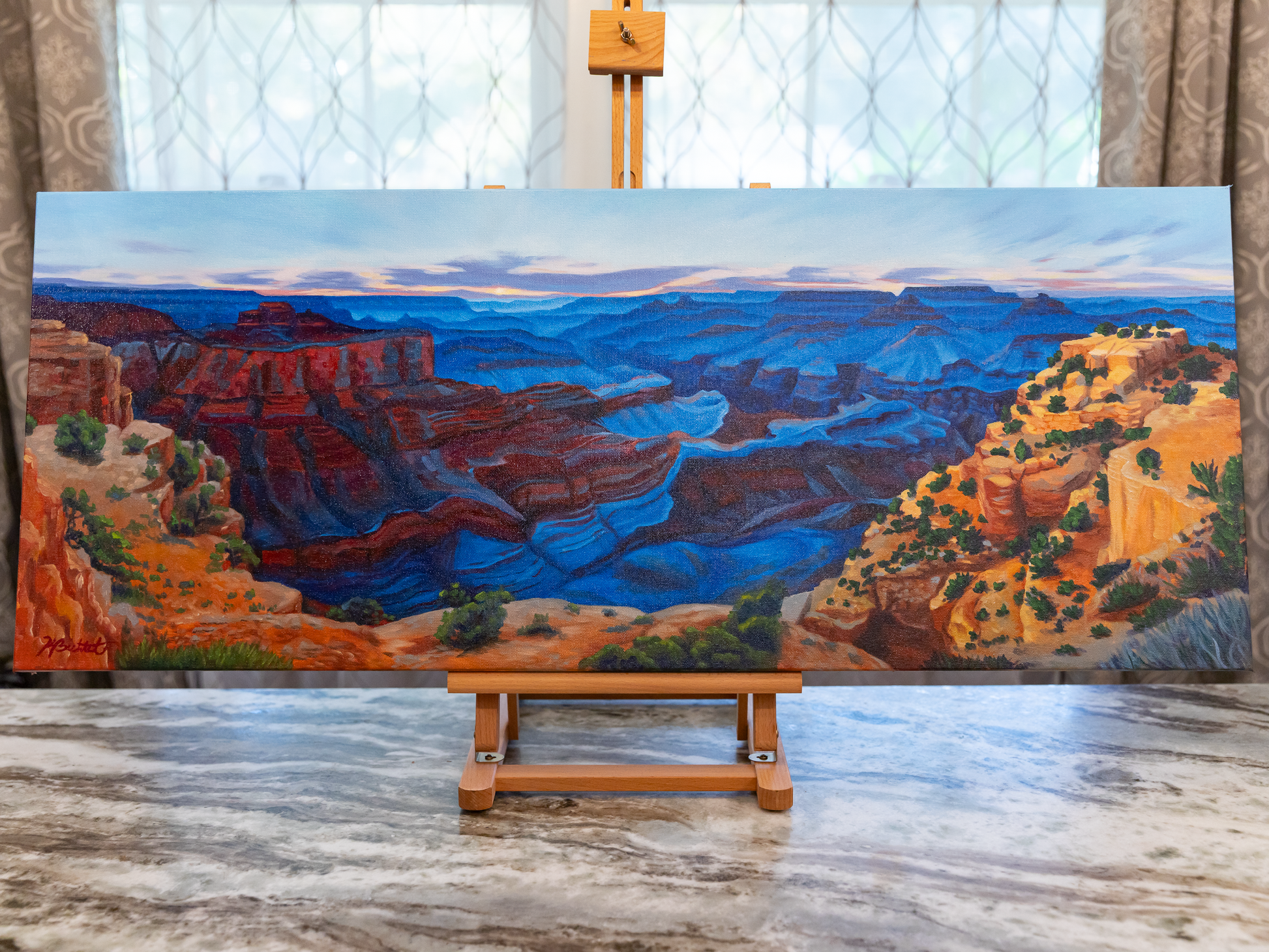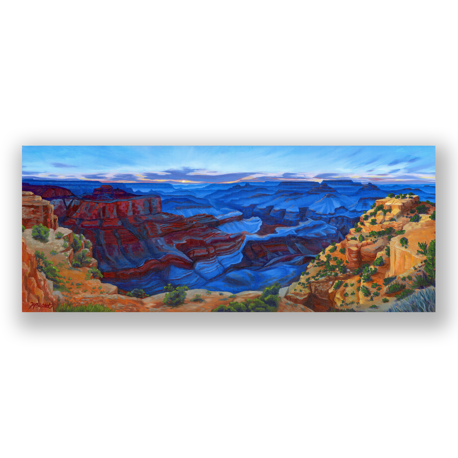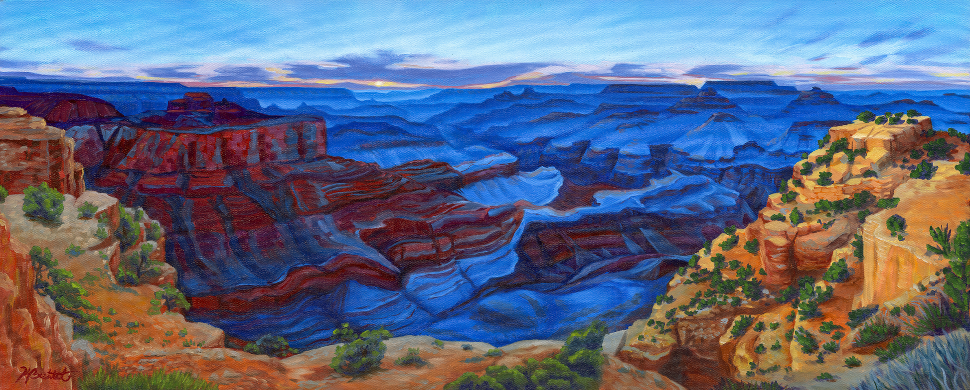The deep sapphire of blue hour sweeps across canyon valleys with the last touch of daylight illuminating the cliffs in the foreground in this original oil painting of the Grand Canyon.