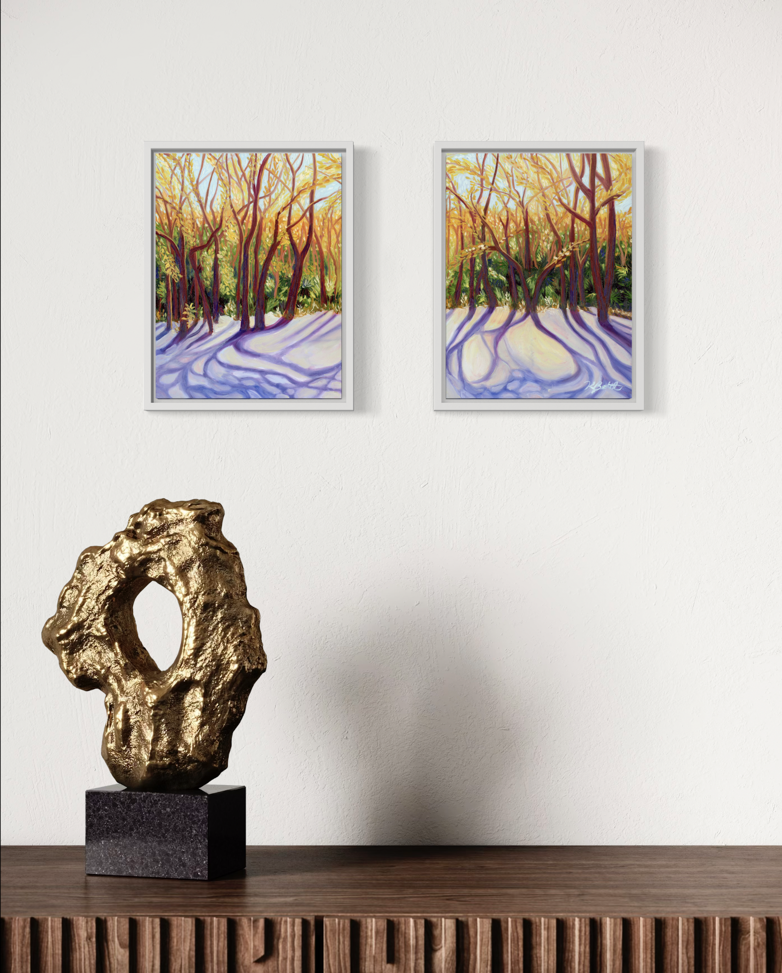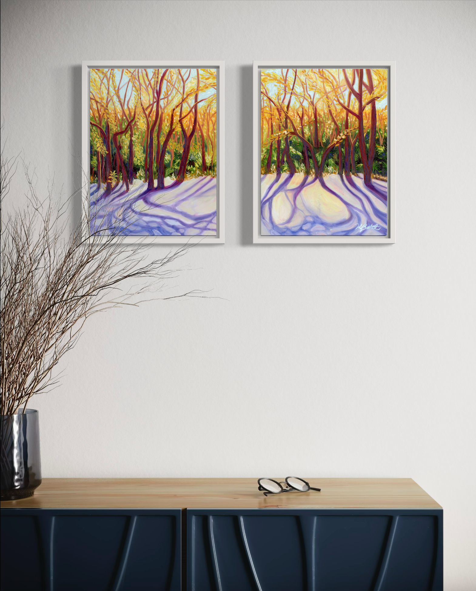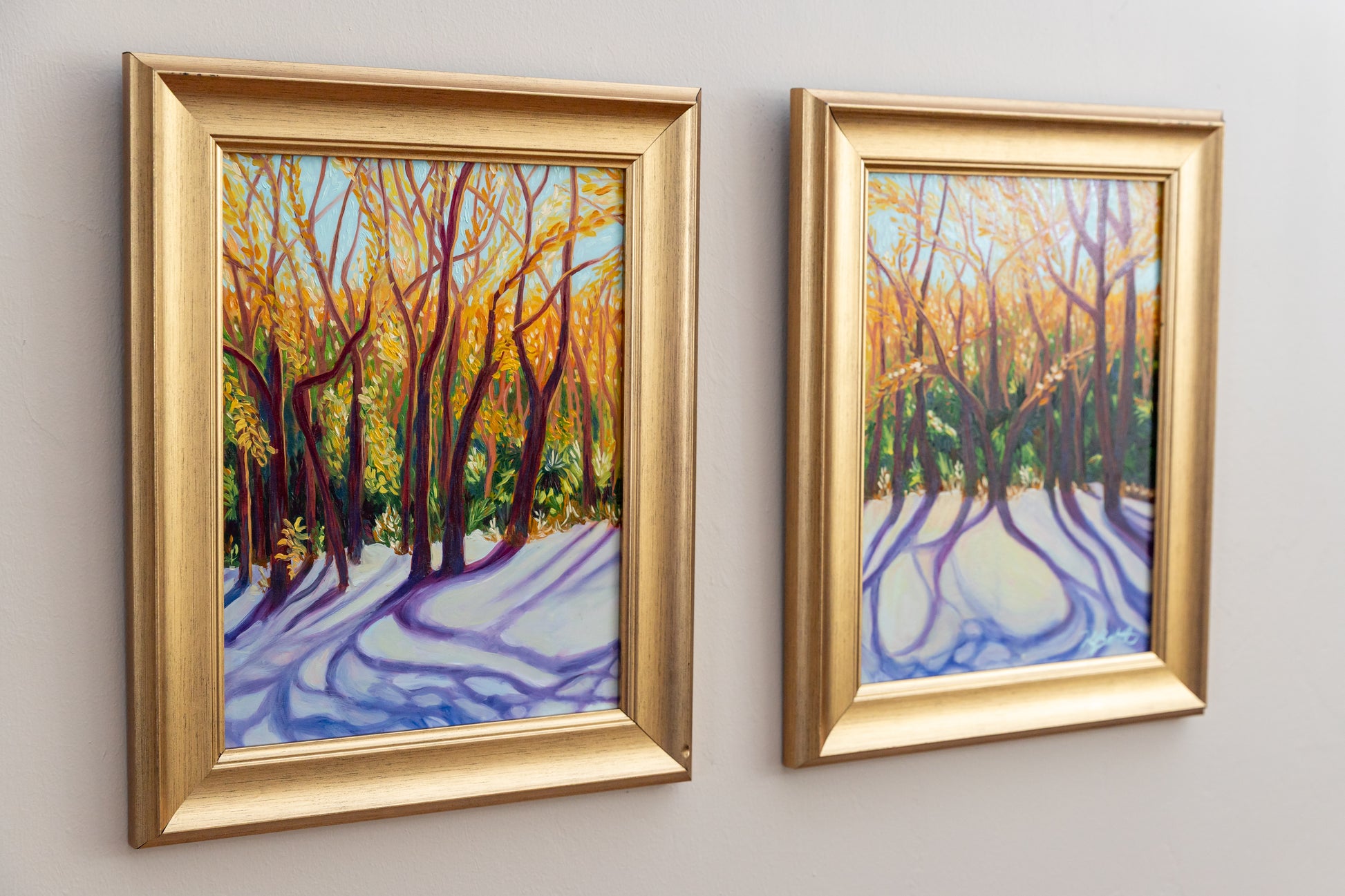 Warm golden sunlight glows through backlit fall trees in this original oil painting. The light casts blue and purple shadows across the snow, lit to glow in parallel with the fall leaves of north Florida, not usually dropping to the winter cold but caught unawares in the unprecedented winter snow of January 2025. This is an original oil painting created in diptych form with two pieces comprising the whole. Both panels will be sent to collector.