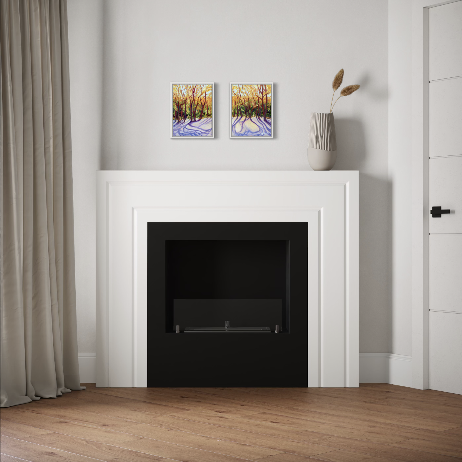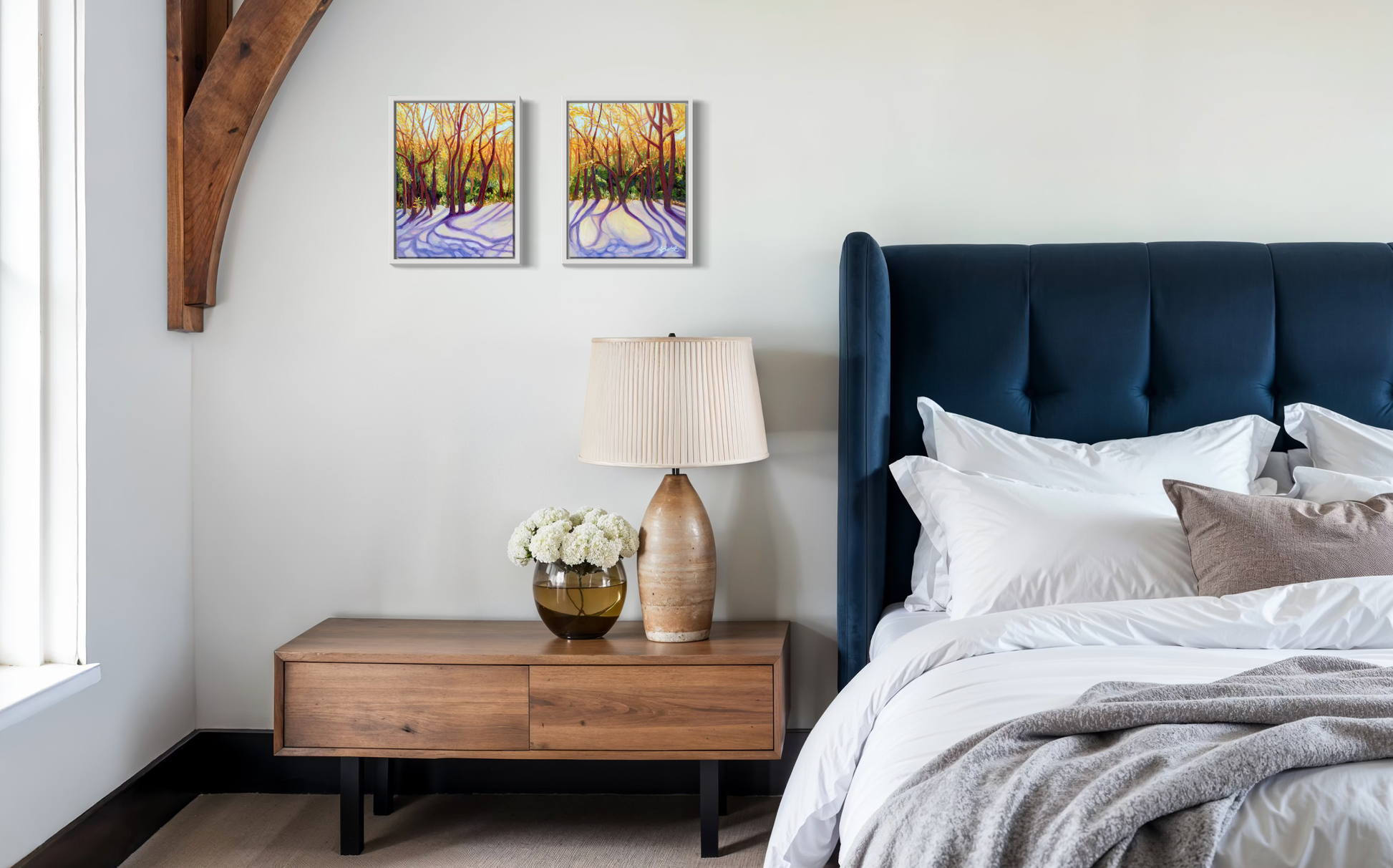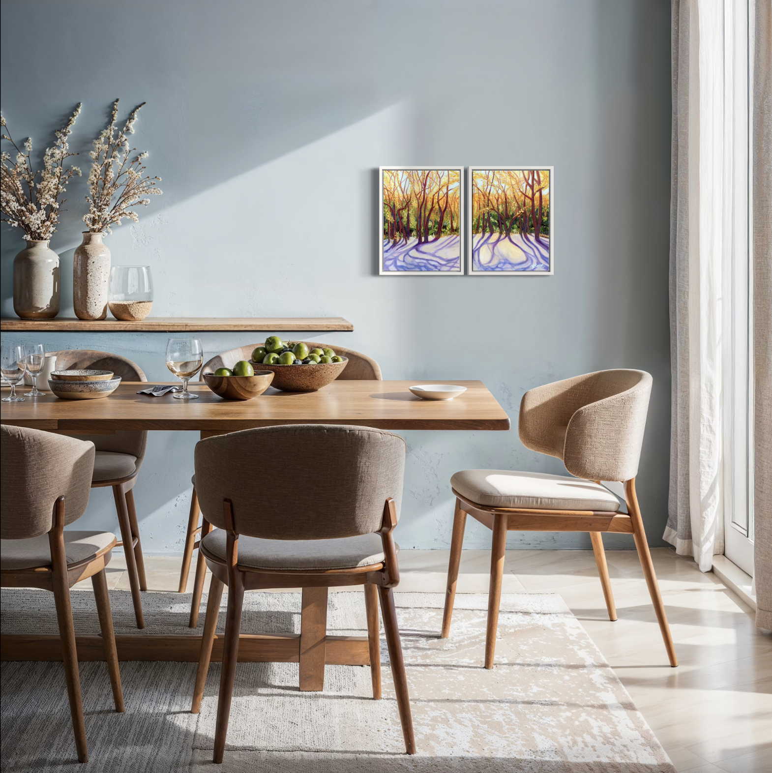 Warm golden sunlight glows through backlit fall trees in this original oil painting. The light casts blue and purple shadows across the snow, lit to glow in parallel with the fall leaves of north Florida, not usually dropping to the winter cold but caught unawares in the unprecedented winter snow of January 2025. This is an original oil painting created in diptych form with two pieces comprising the whole. Both panels will be sent to collector.