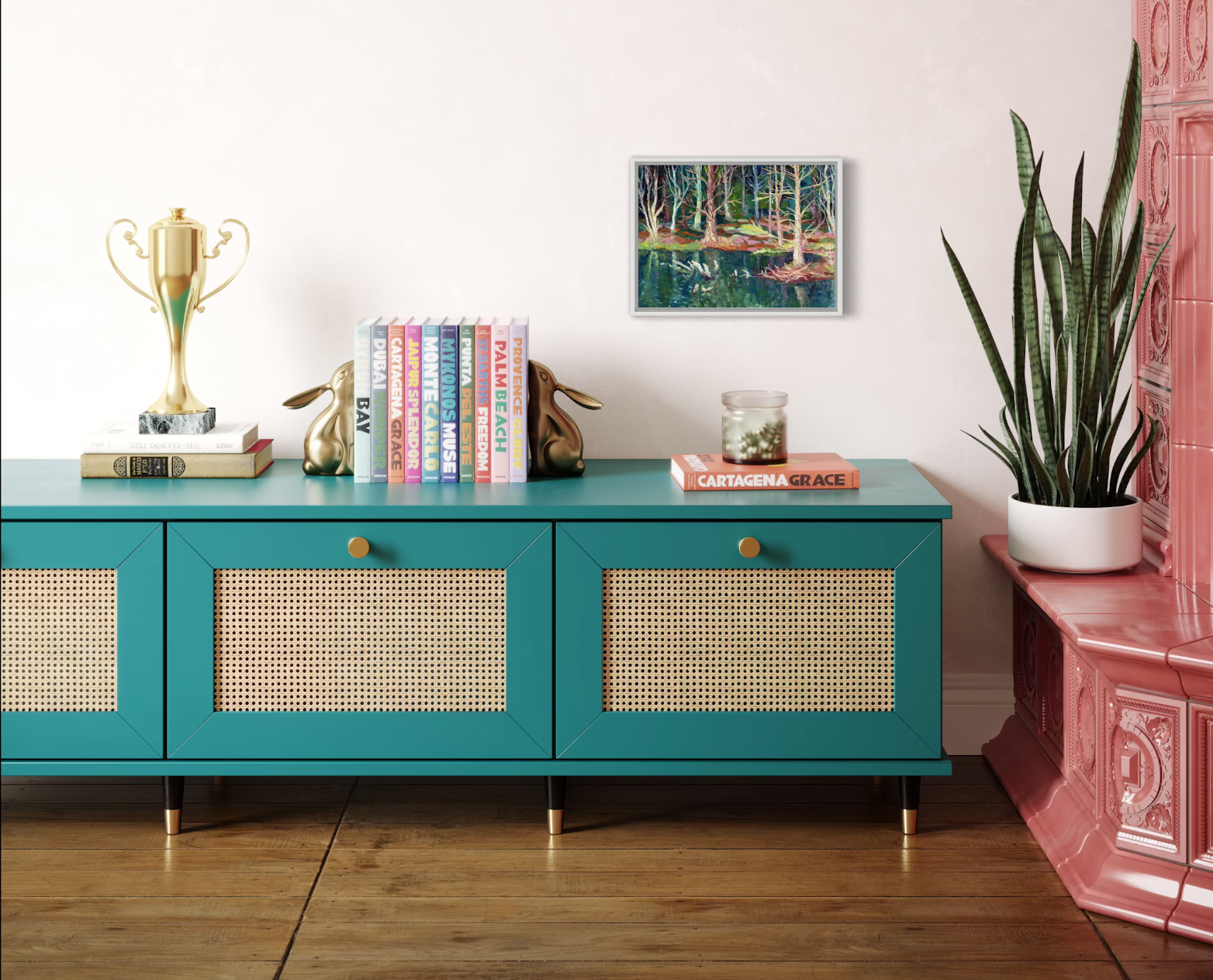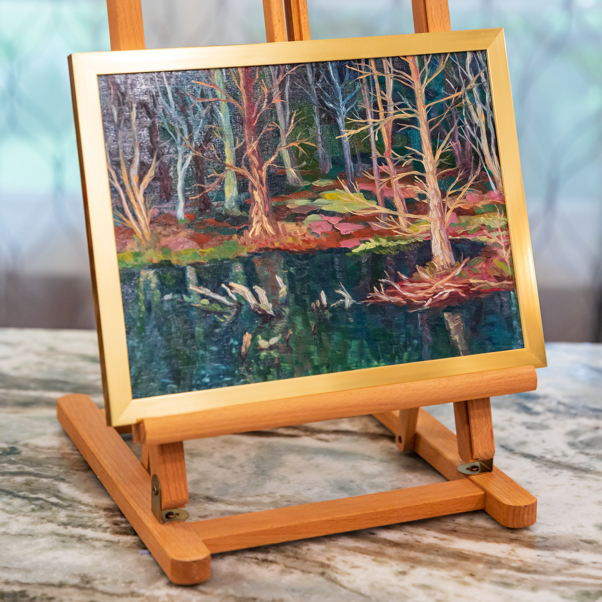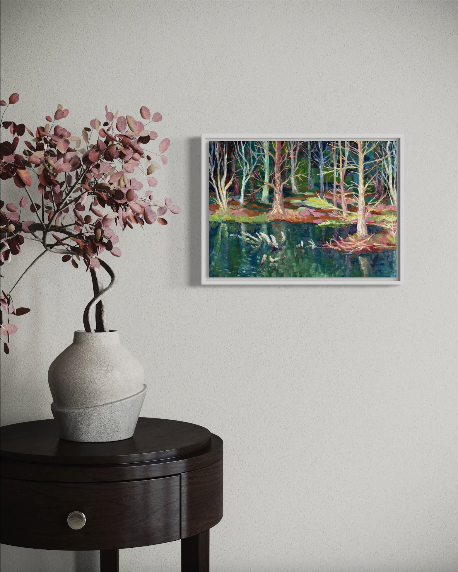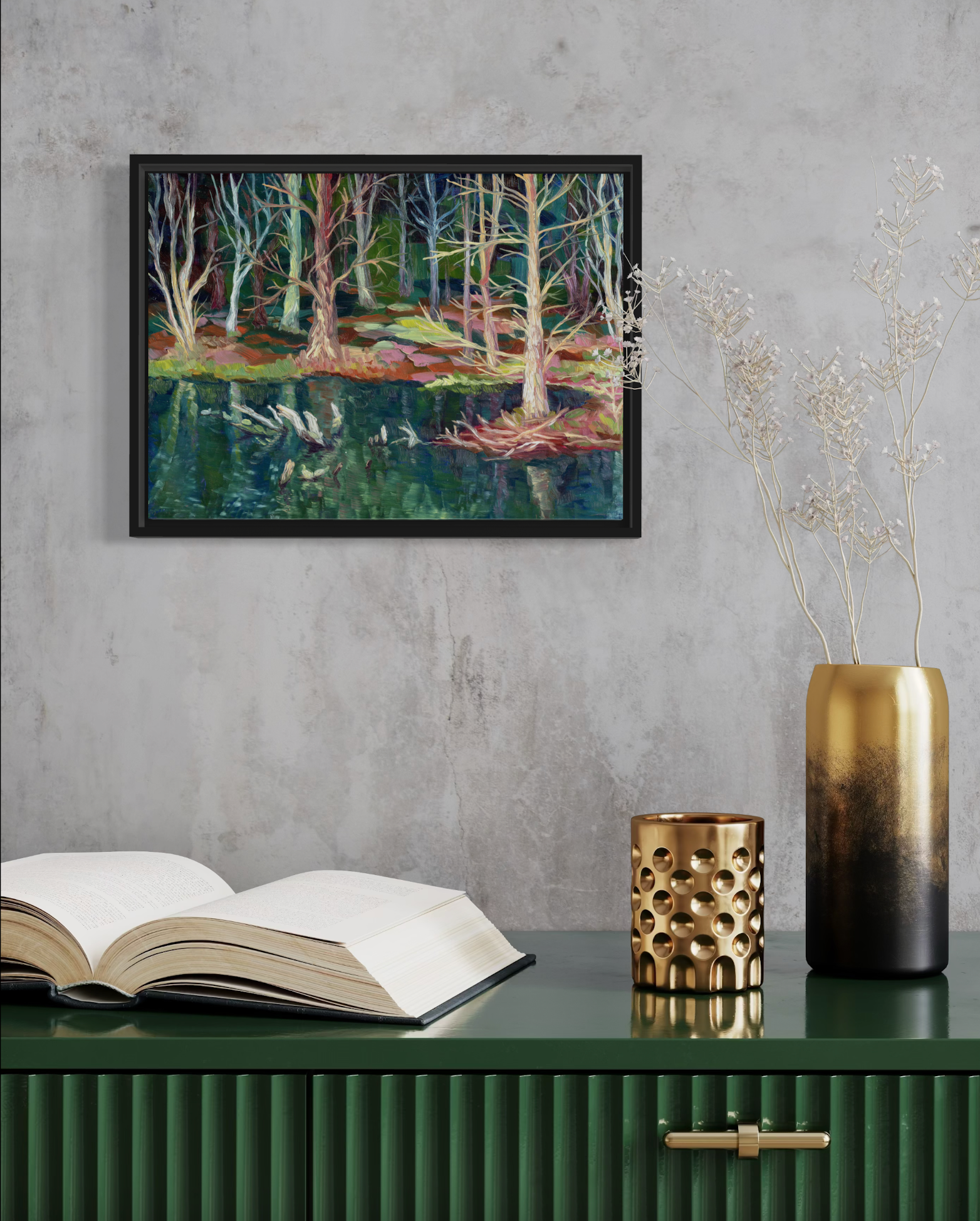 Surreal colors and luminous reflections cascade across the water in this oil landscape painting. Winter bare pine trees reflect on water, surrounding a group of sun-bathing turtles in surreal color in this North Florida forest scene. Impasto paint strokes and expressive color make the viewer think of enchanted forests and magical retreats.