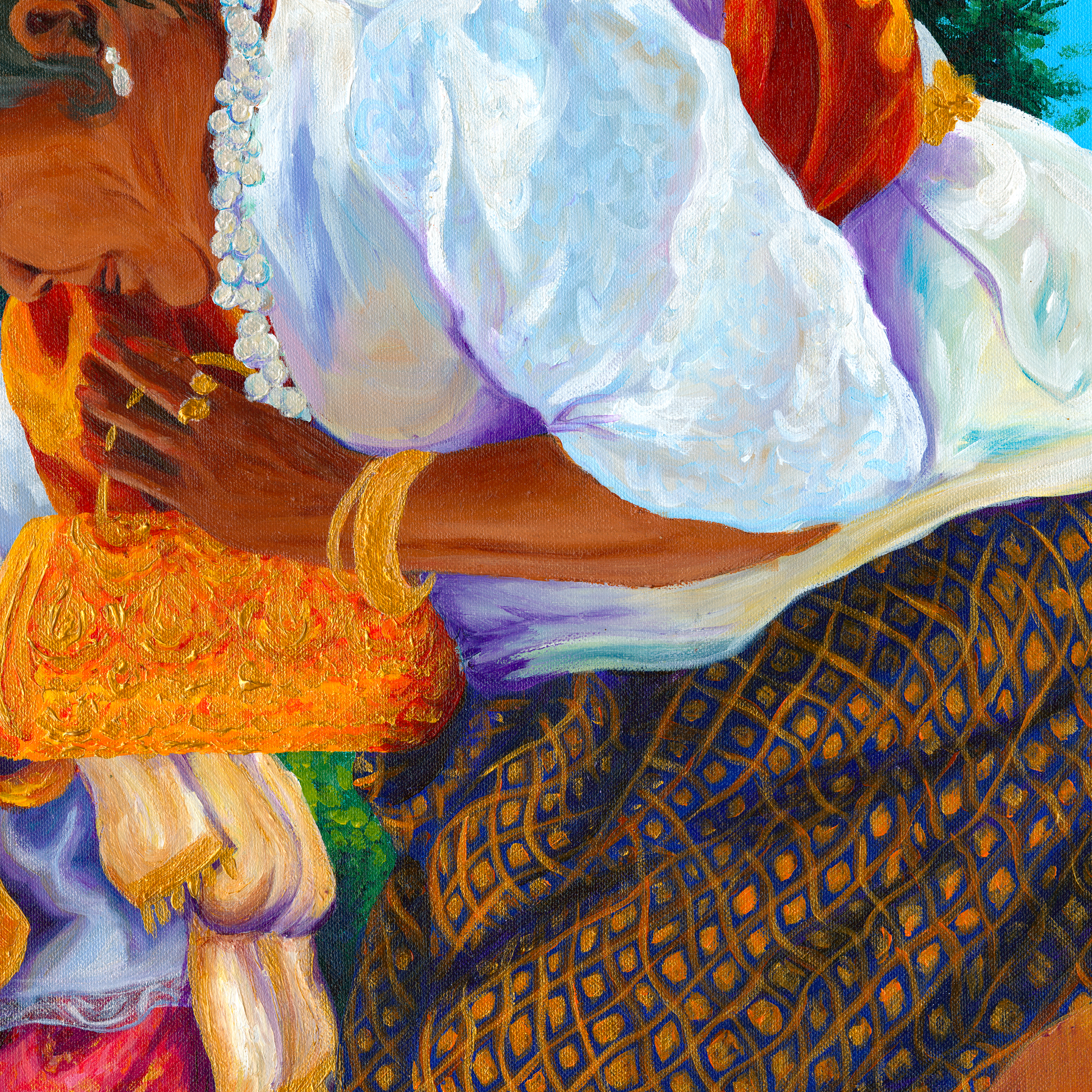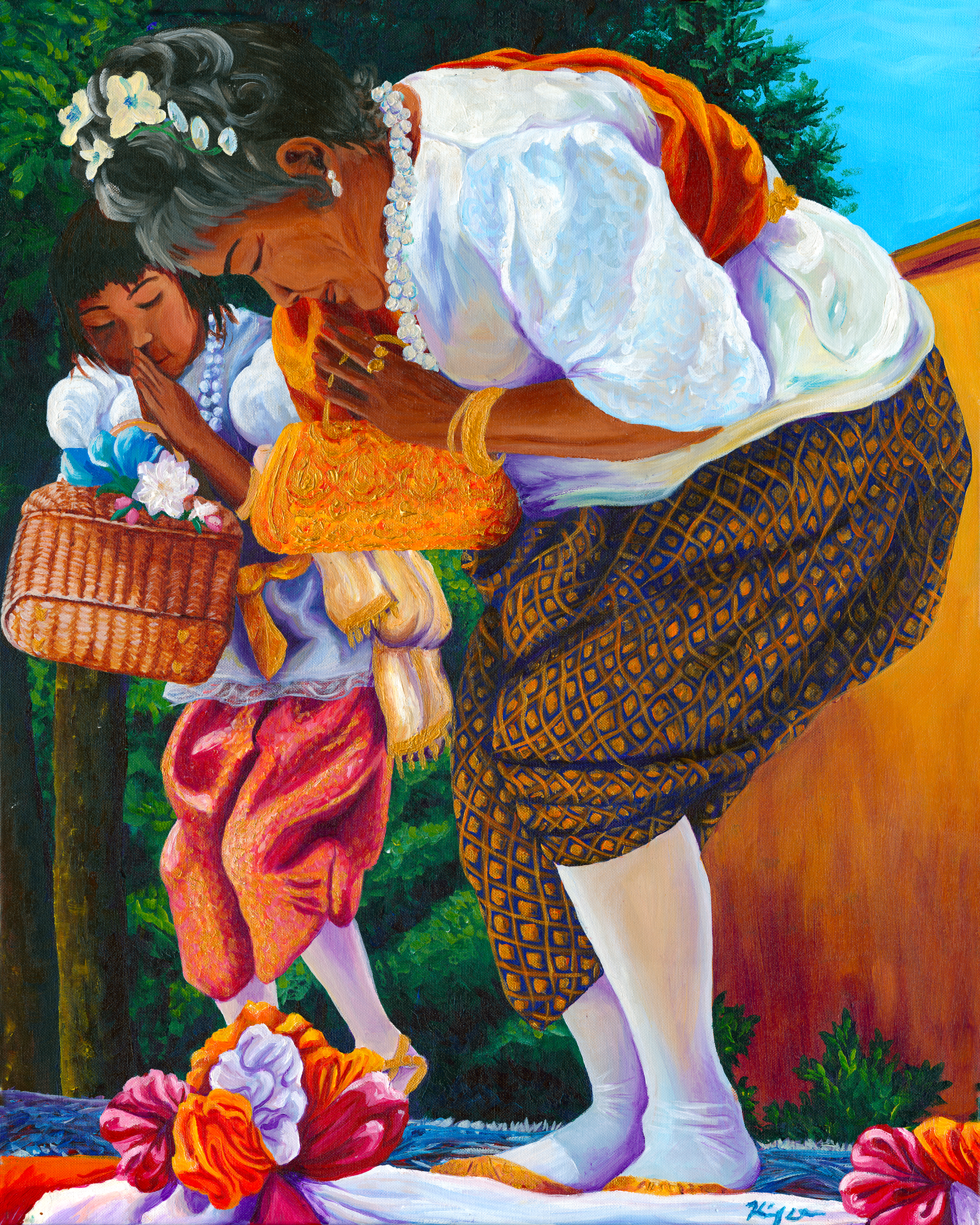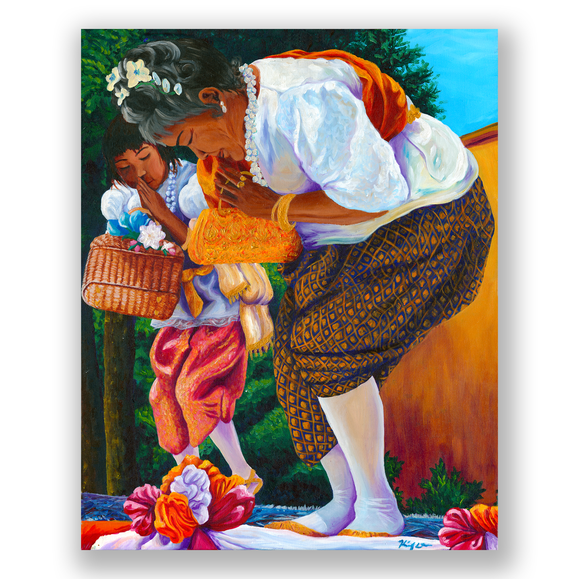 Beautiful colors, fabrics and textures highlight the respectful gesture of the 'Wai' greeting shared between grandmother and child from Thailand in this original painting.