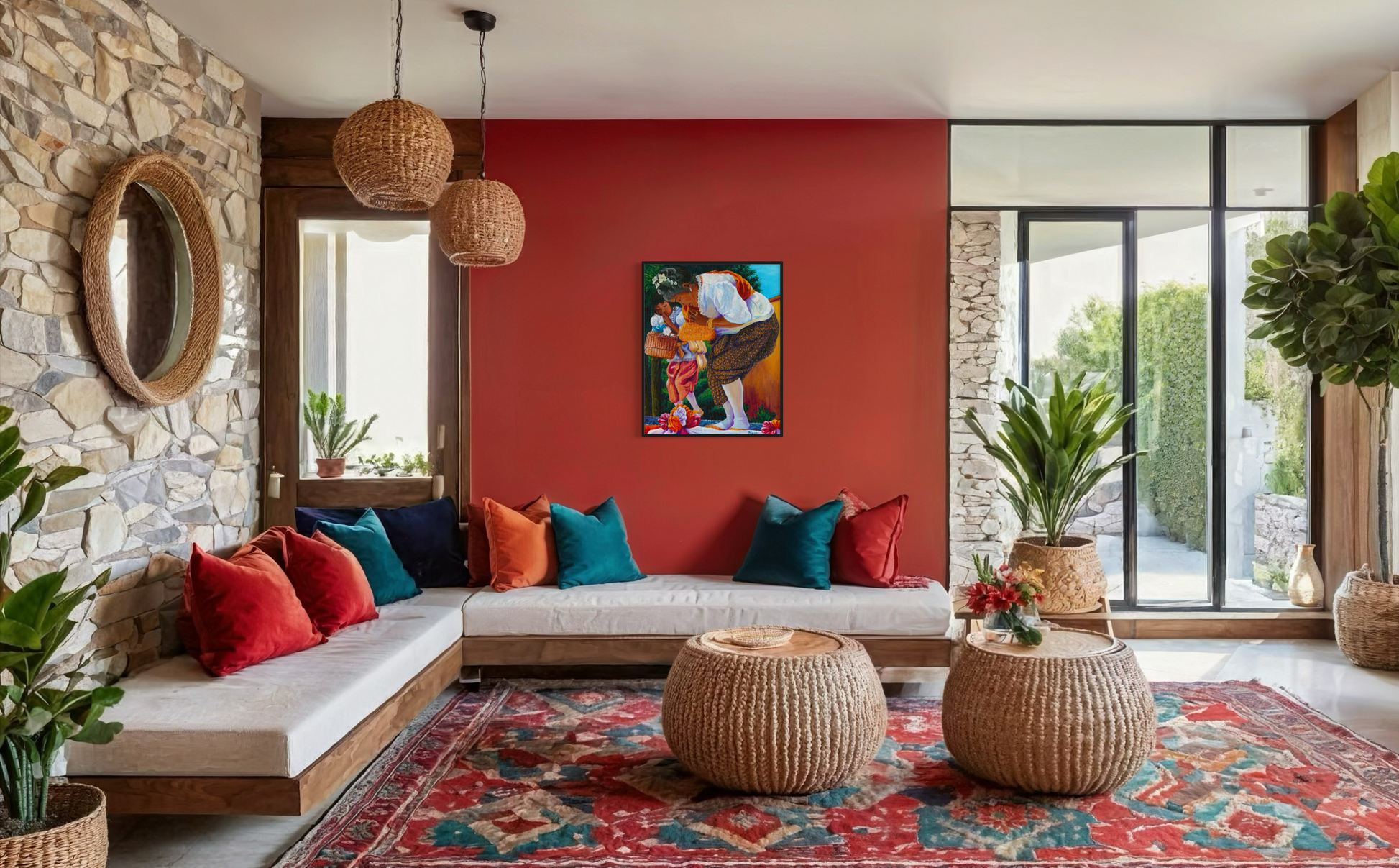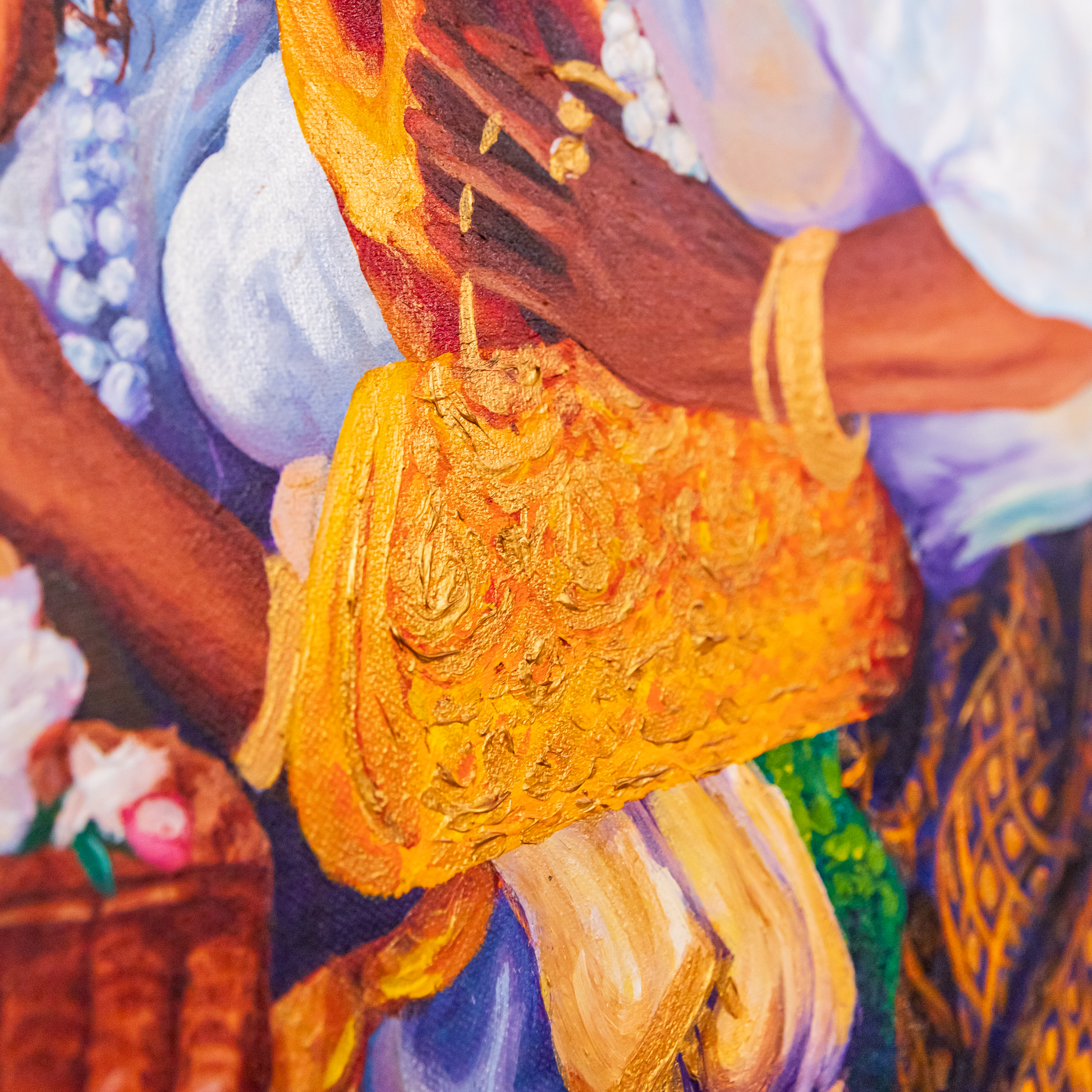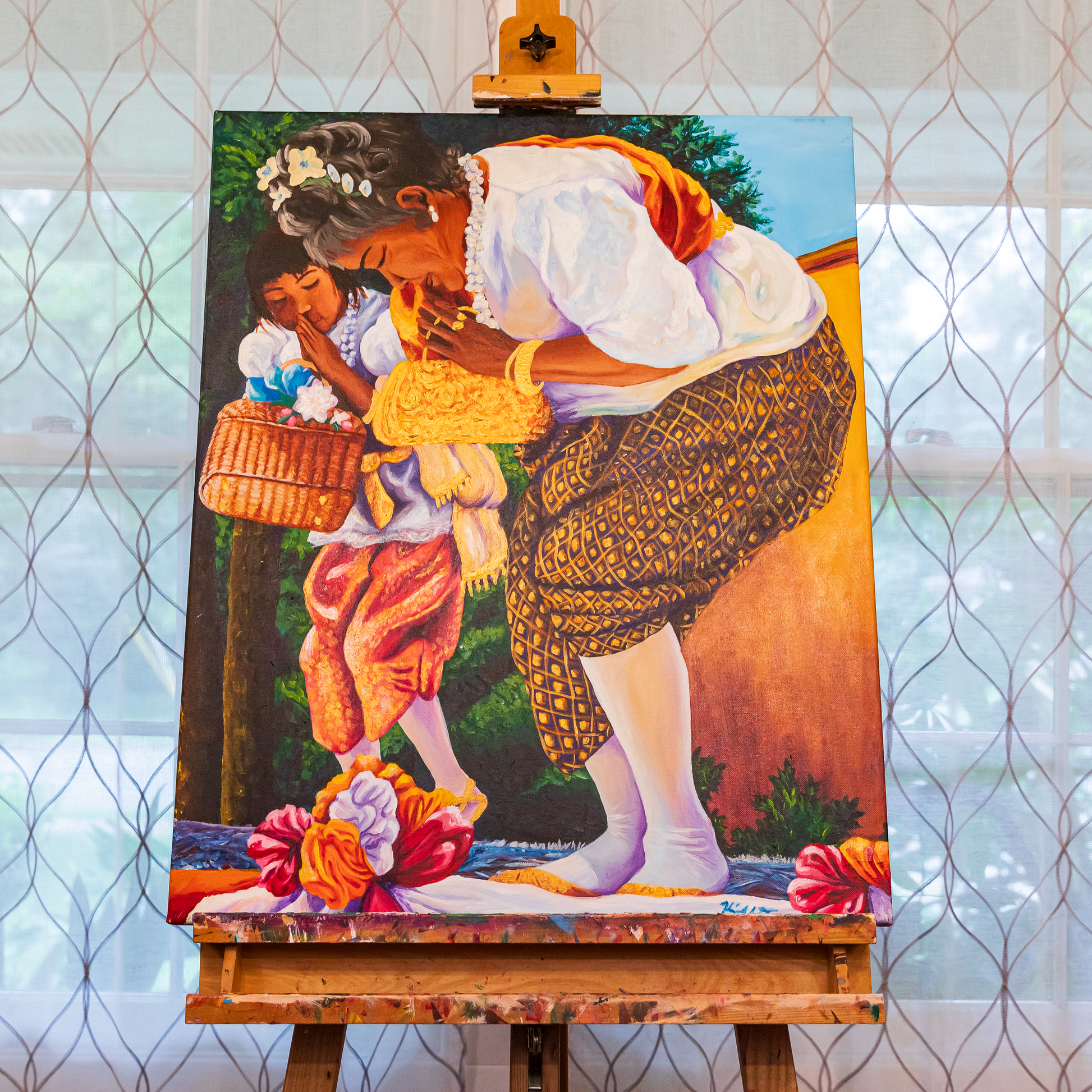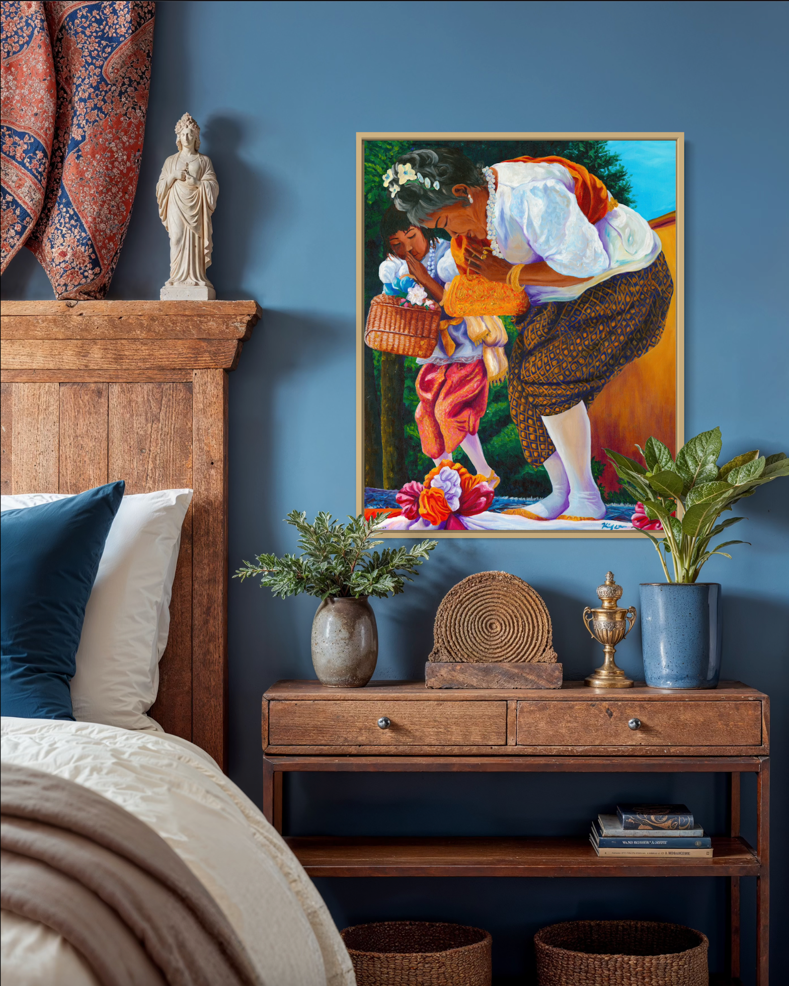 Beautiful colors, fabrics and textures highlight the respectful gesture of the 'Wai' greeting shared between grandmother and child from Thailand in this original painting.