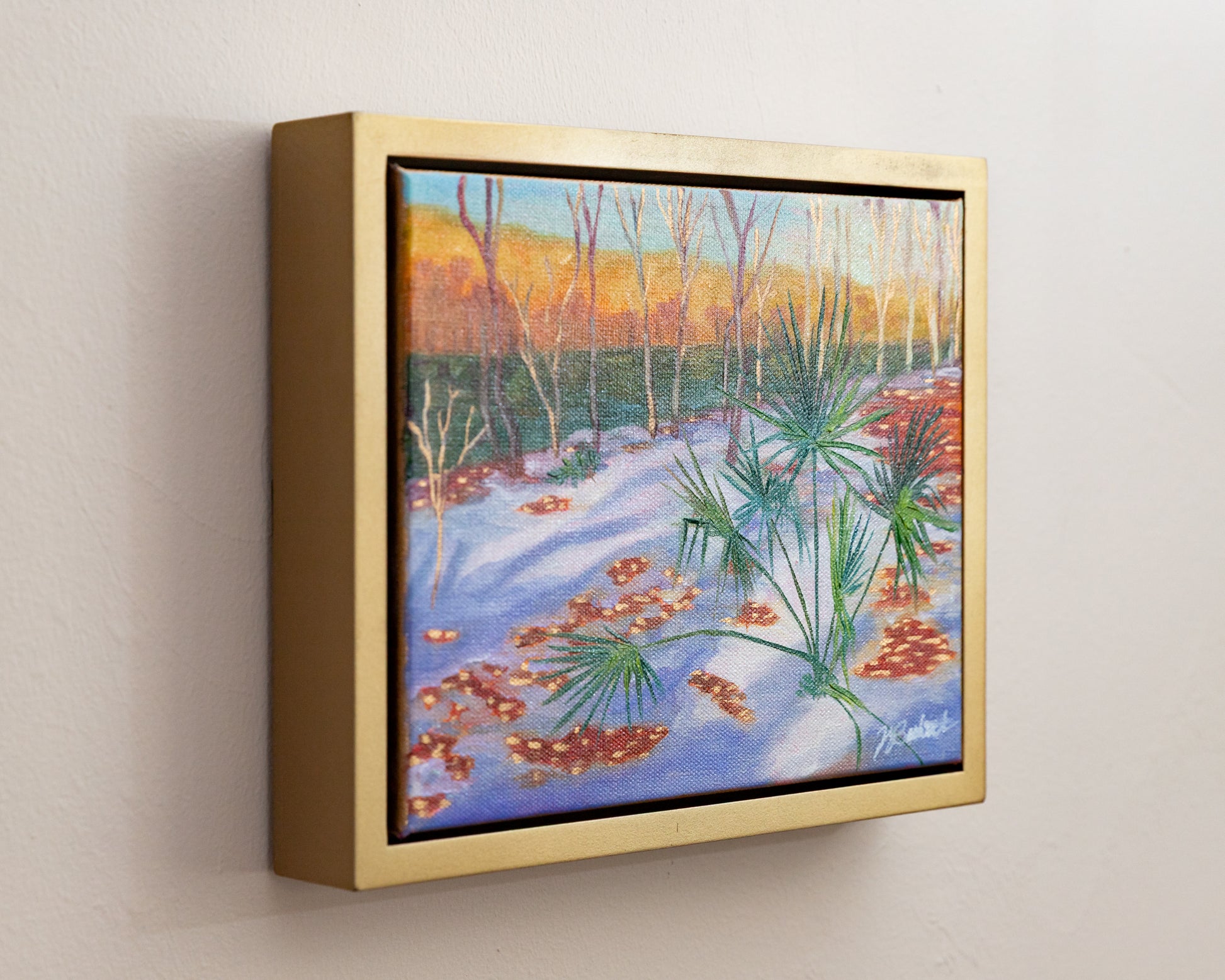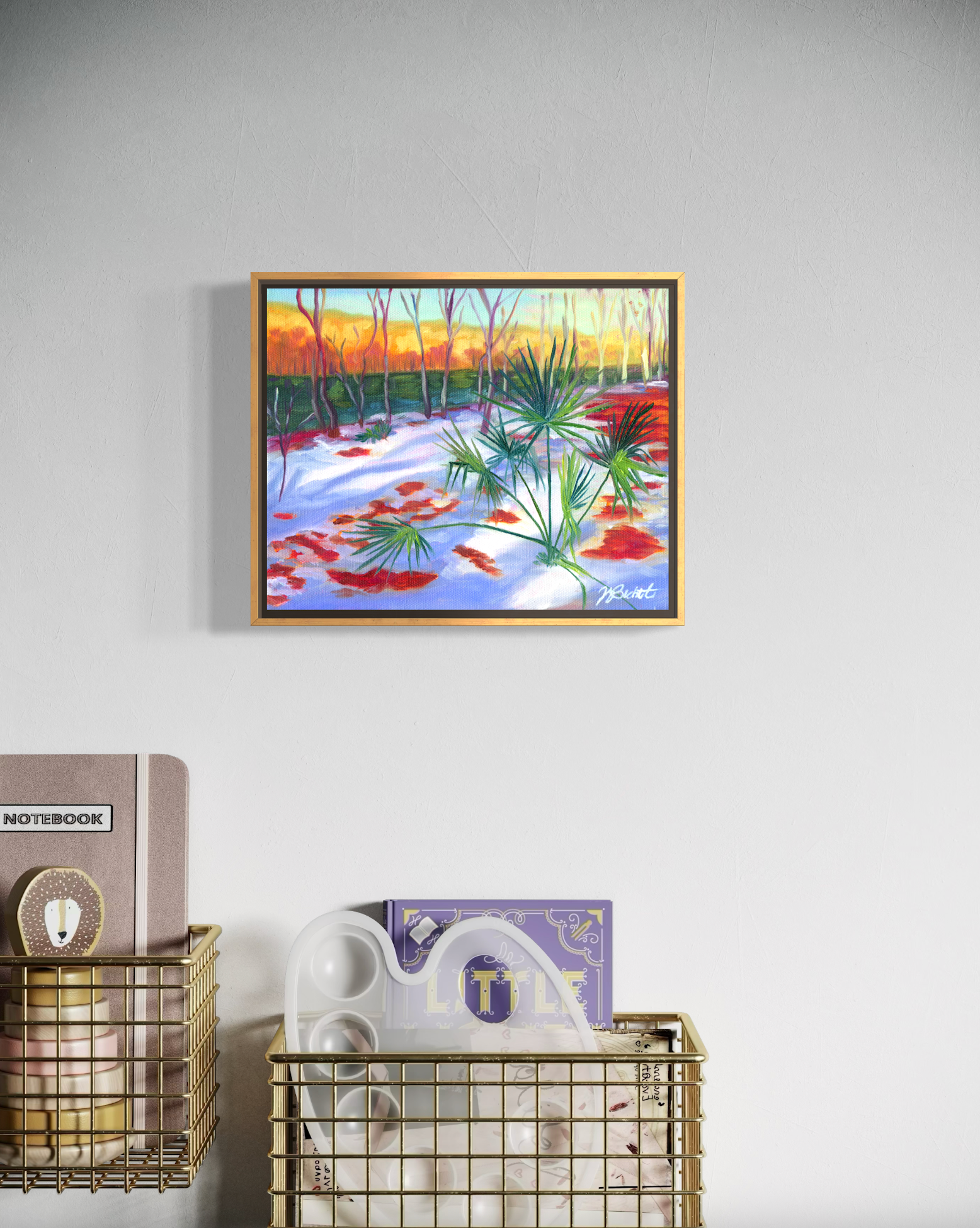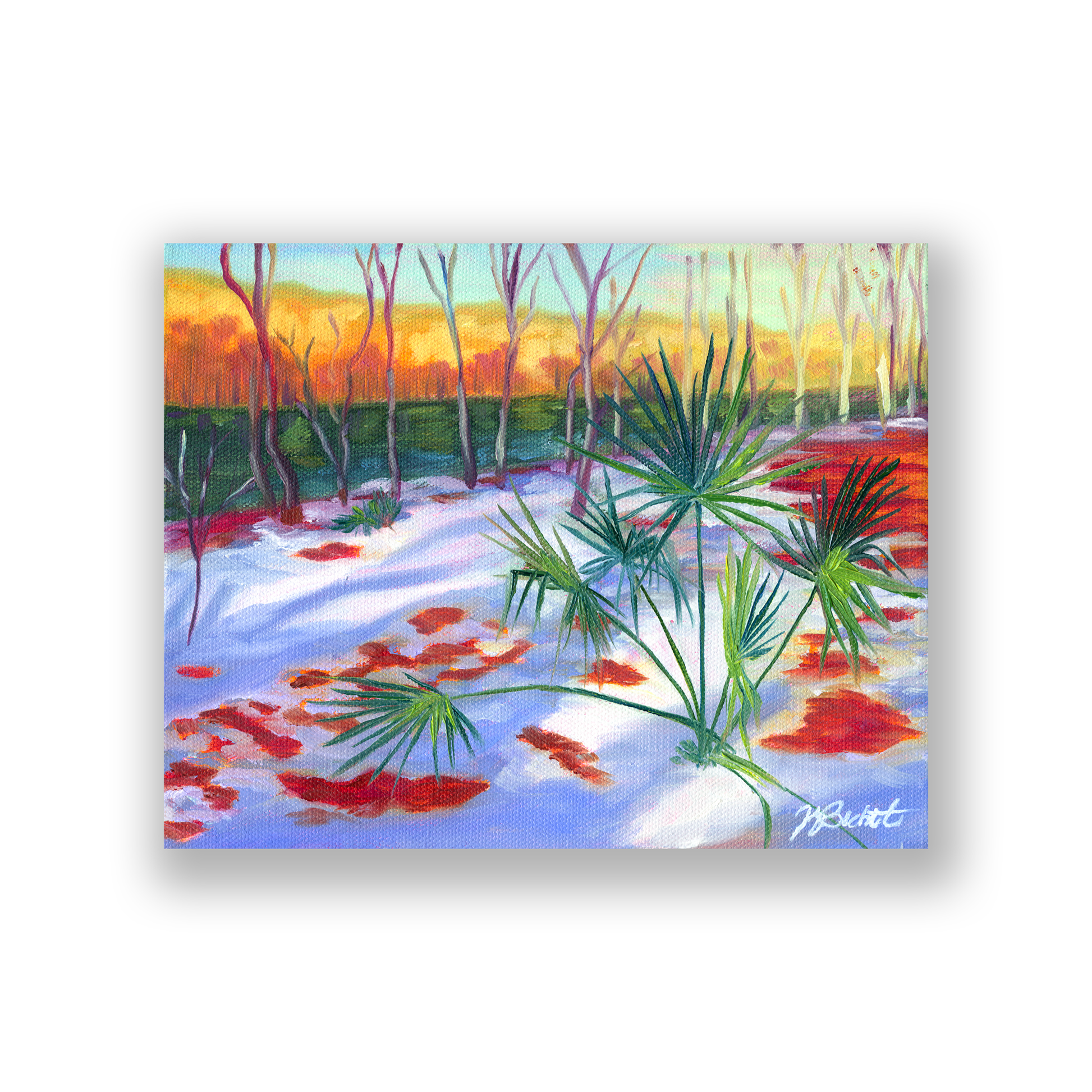 Green palm branches emerge from snow covered ground in an uncommon pairing after snow fell in north Florida January 2025. This original oil painting captures the strange juxtaposition of climates, the orange and green of southern ground and plant-life peeking through against the purple and blue shadows cast across white blanketed ground.