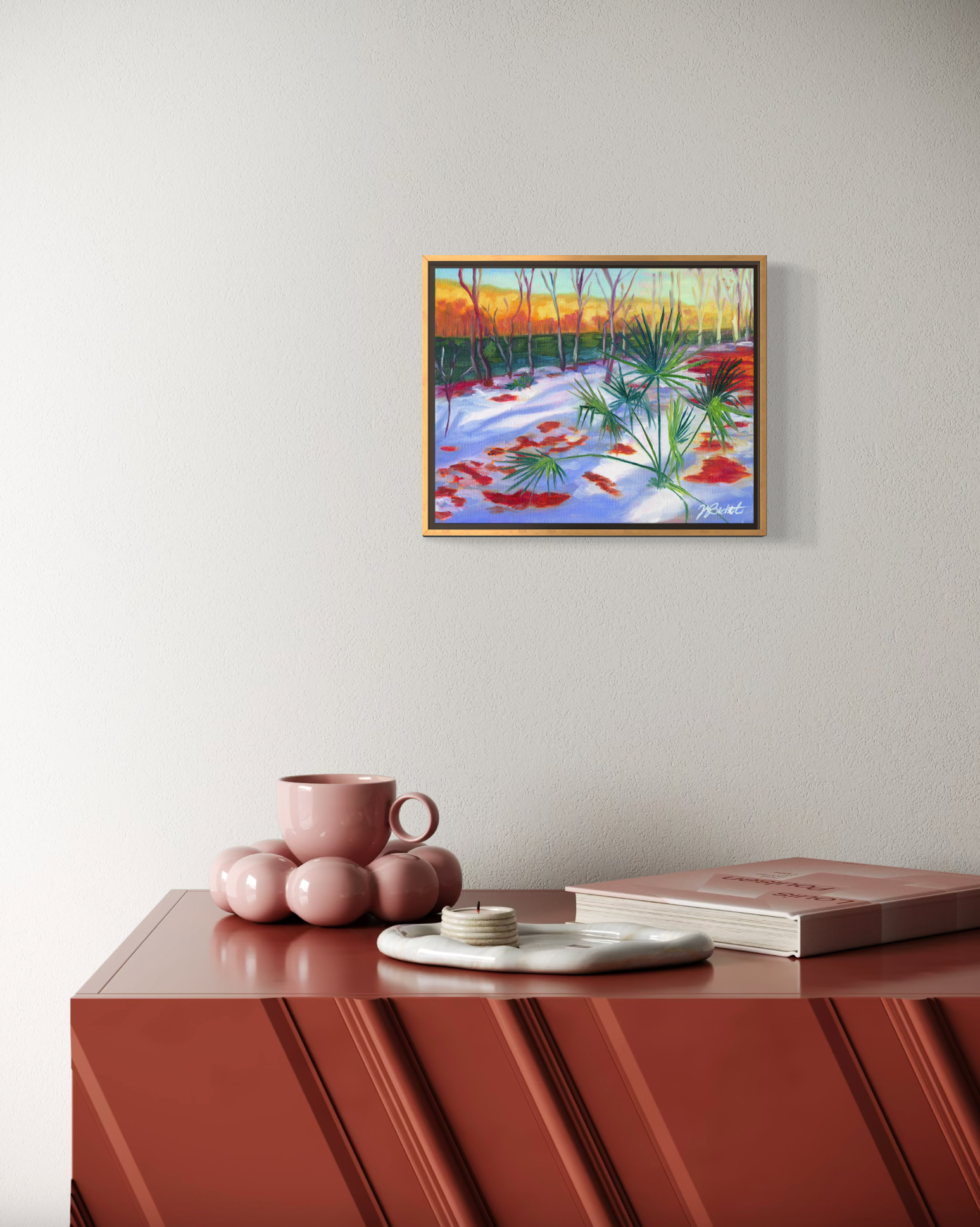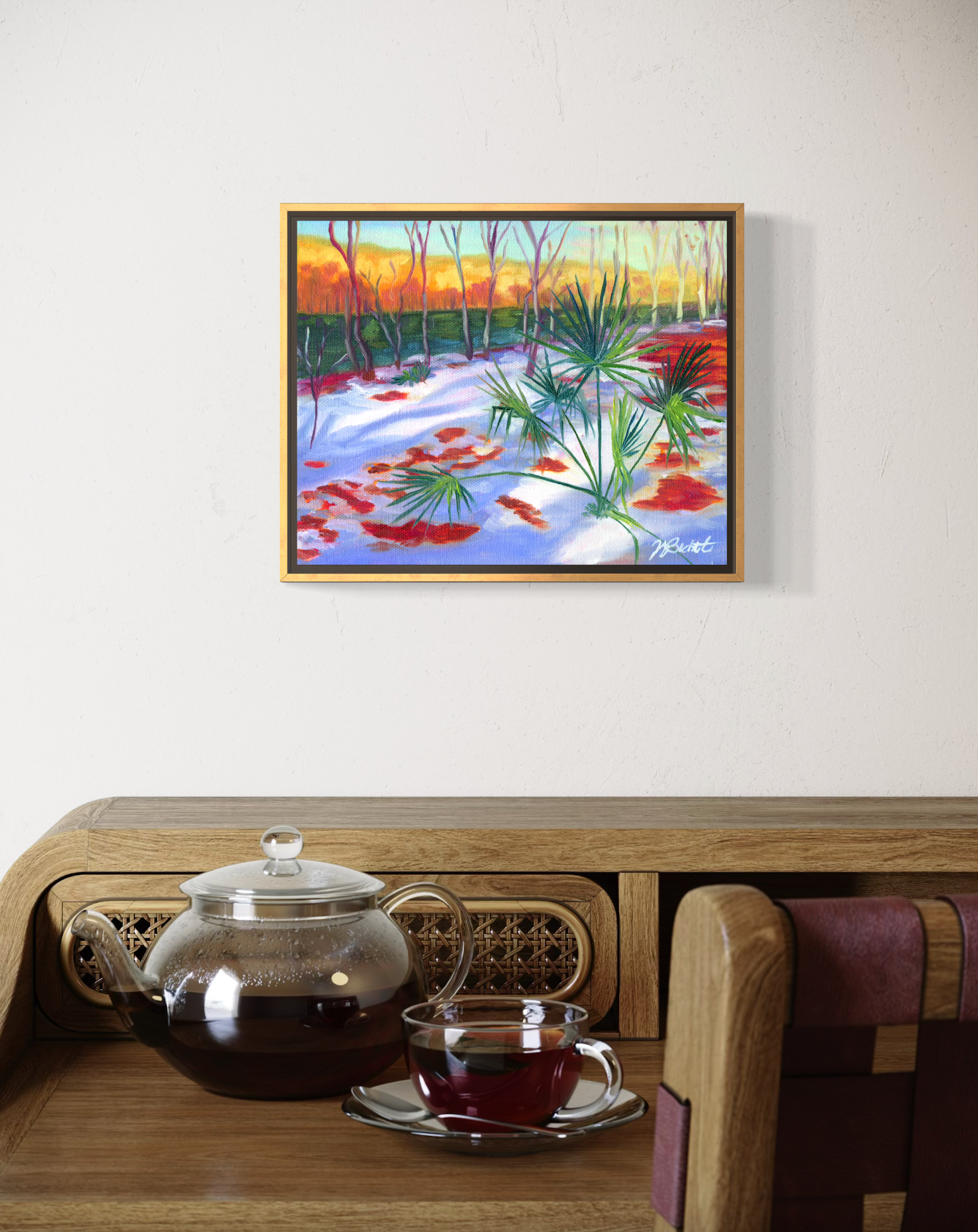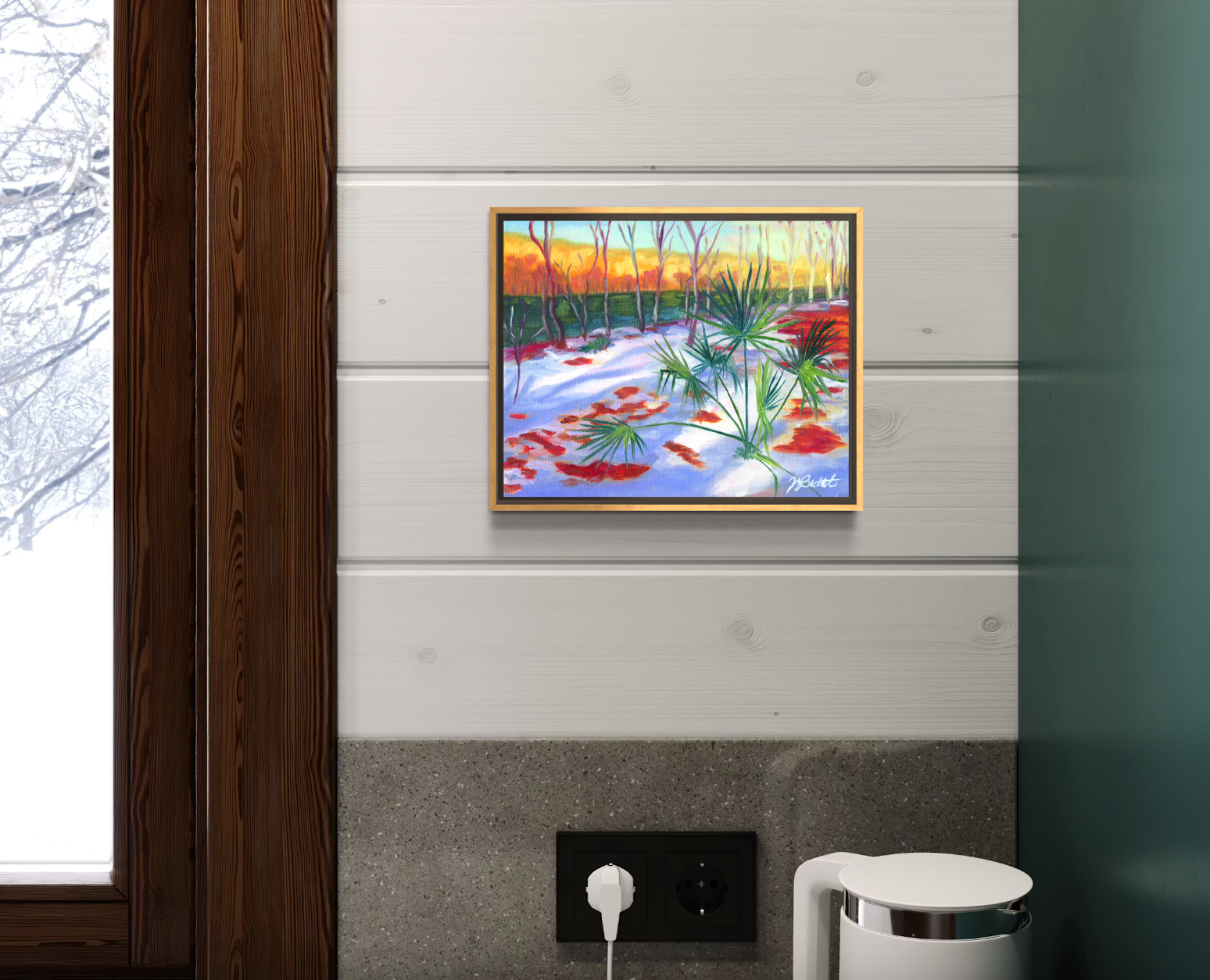 Green palm branches emerge from snow covered ground in an uncommon pairing after snow fell in north Florida January 2025. This original oil painting captures the strange juxtaposition of climates, the orange and green of southern ground and plant-life peeking through against the purple and blue shadows cast across white blanketed ground.