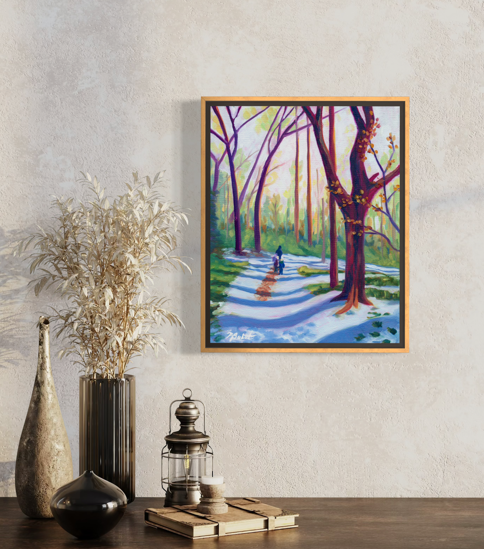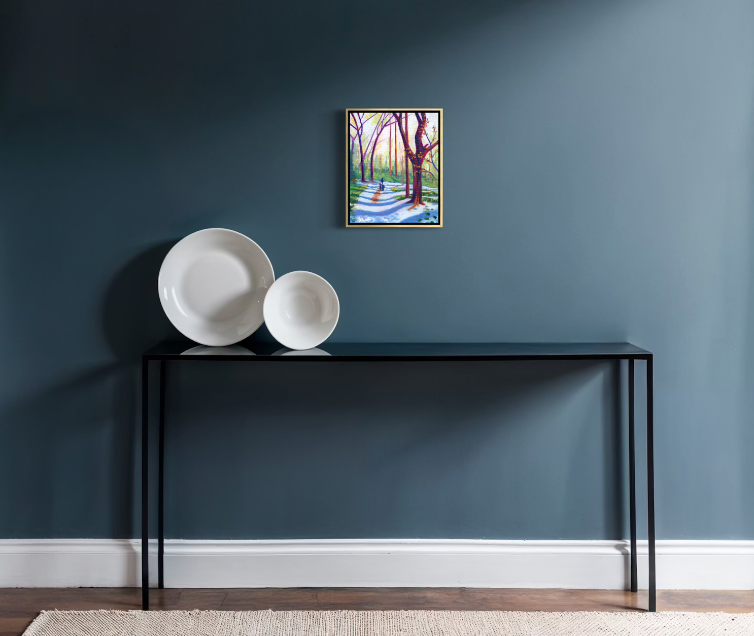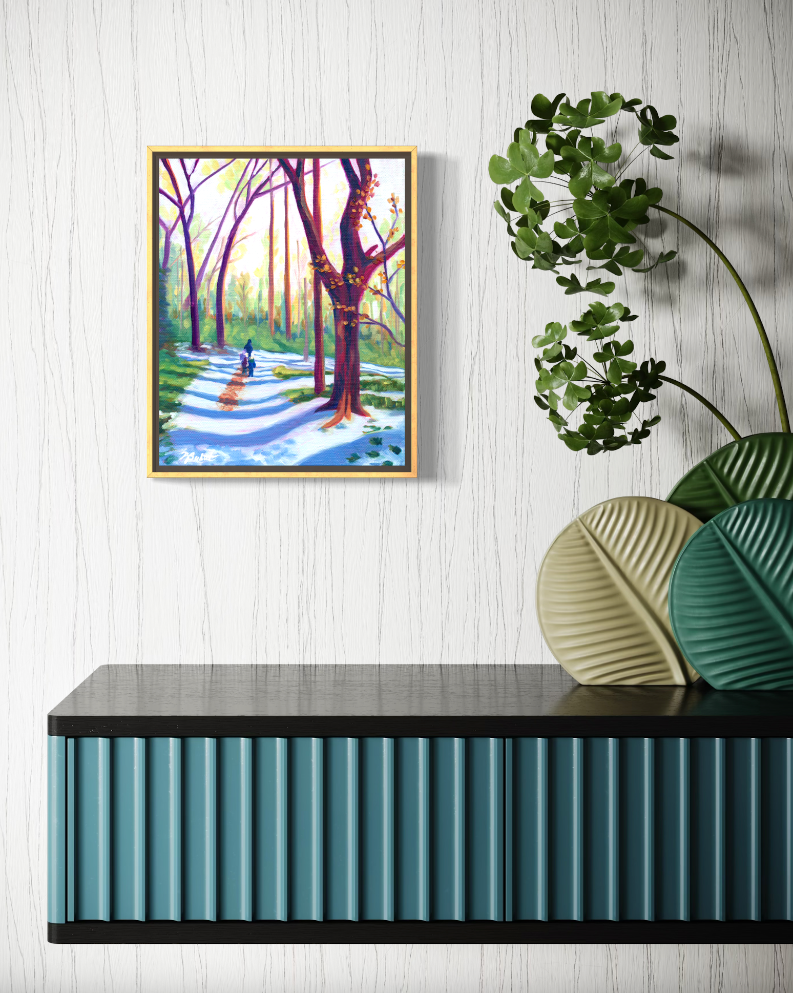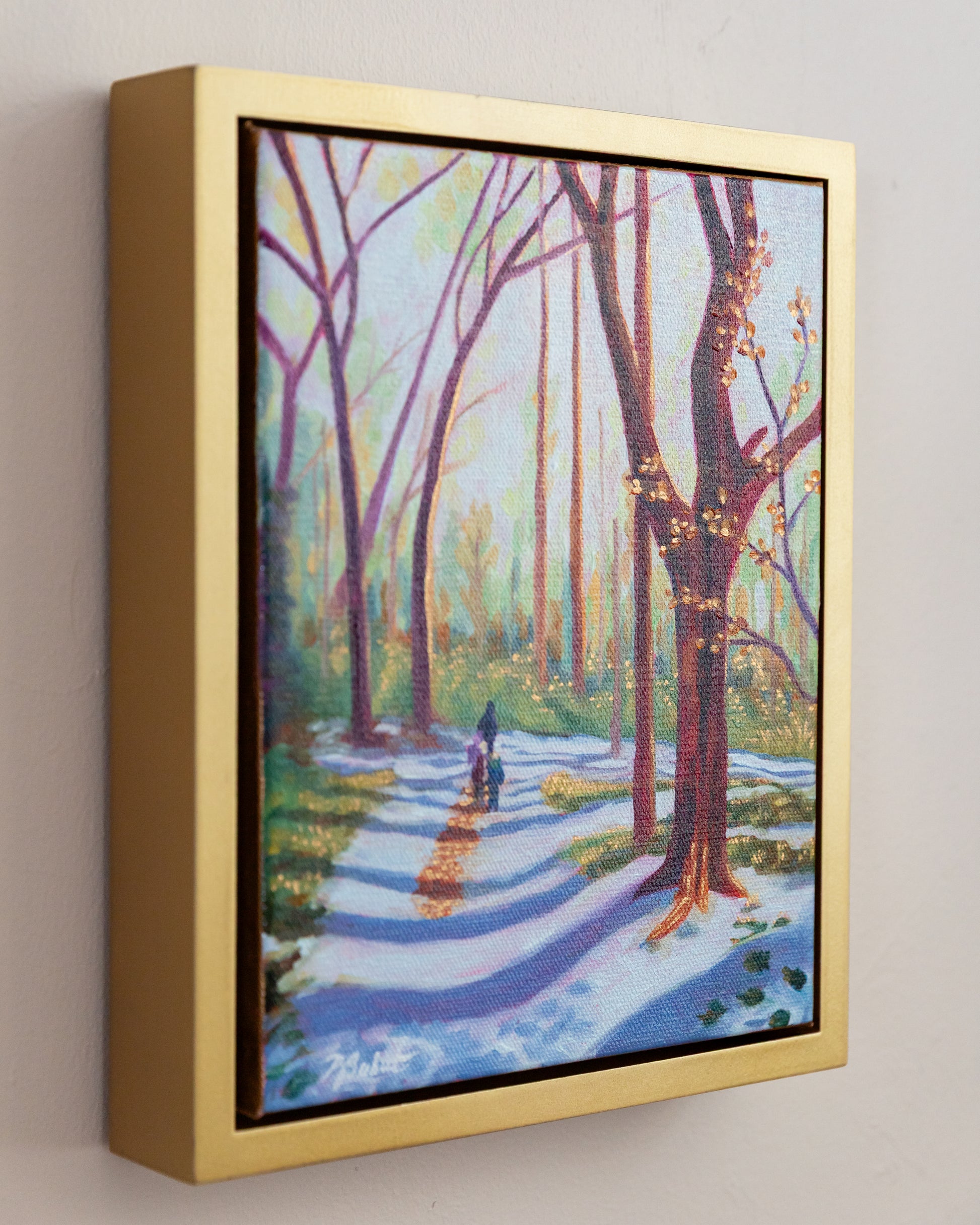 Snow gently covers the path in a pine forest where a small family takes a walk. This is my personal favorite from the Florida snow series as that little family is my own and although it depicts a surprisingly cold snow-day in Florida, my heart warms with the memory. I hope it recalls cosy memories for its future home as well.